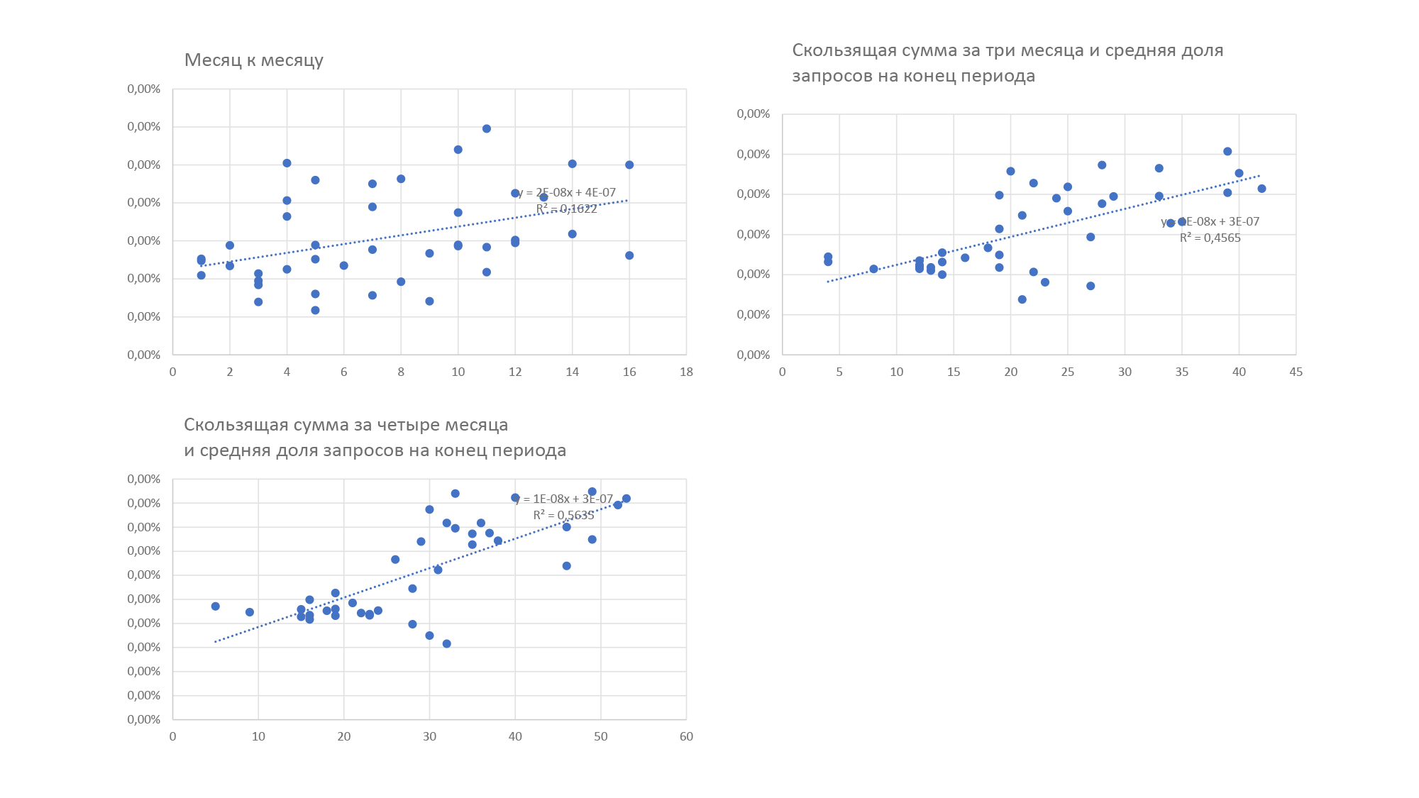 Если не учитывать, что каждое последующее мероприятие имеет накопленные эффекты, то обычная помесячная корреляция количества мероприятий с запросами — имеет не очень высокий коэффициент R² = 0,1622.