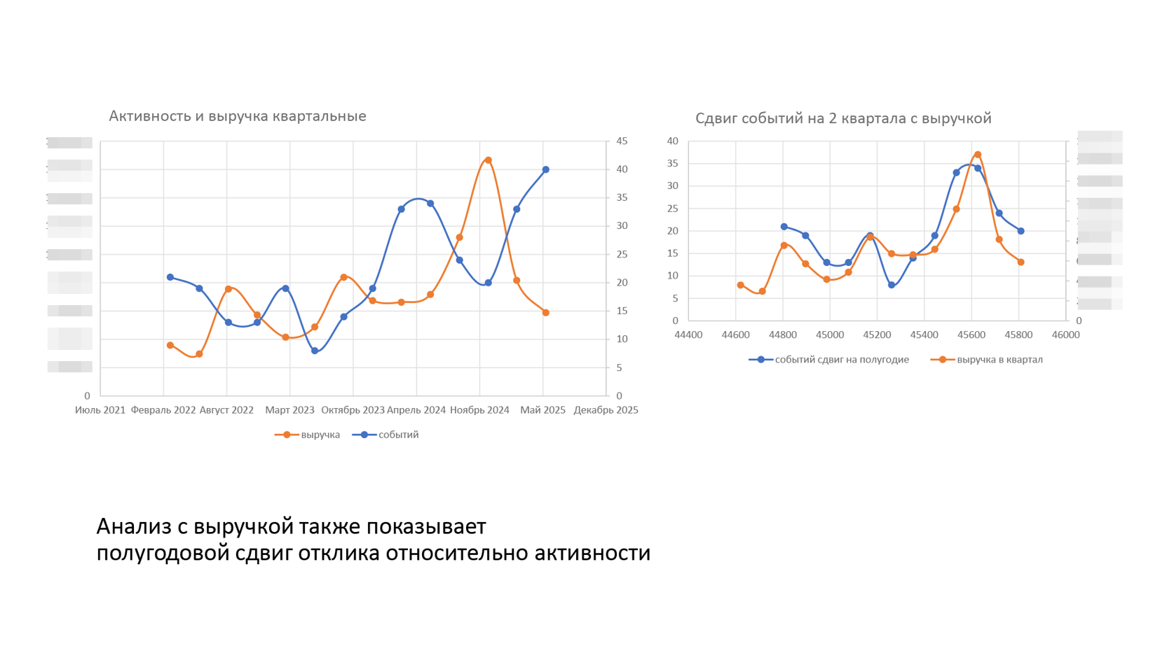 А что же выручка? Мы взяли активность за этот период и сопоставили её с квартальной выручкой. Как видно на левом графике — активность и контракты в B2B имеют отложенную временную связь. Поэтому, если сделать сдвиг графика мероприятий на 2 квартала вперед (для иллюстрации), то это можно очень явно обнаружить.