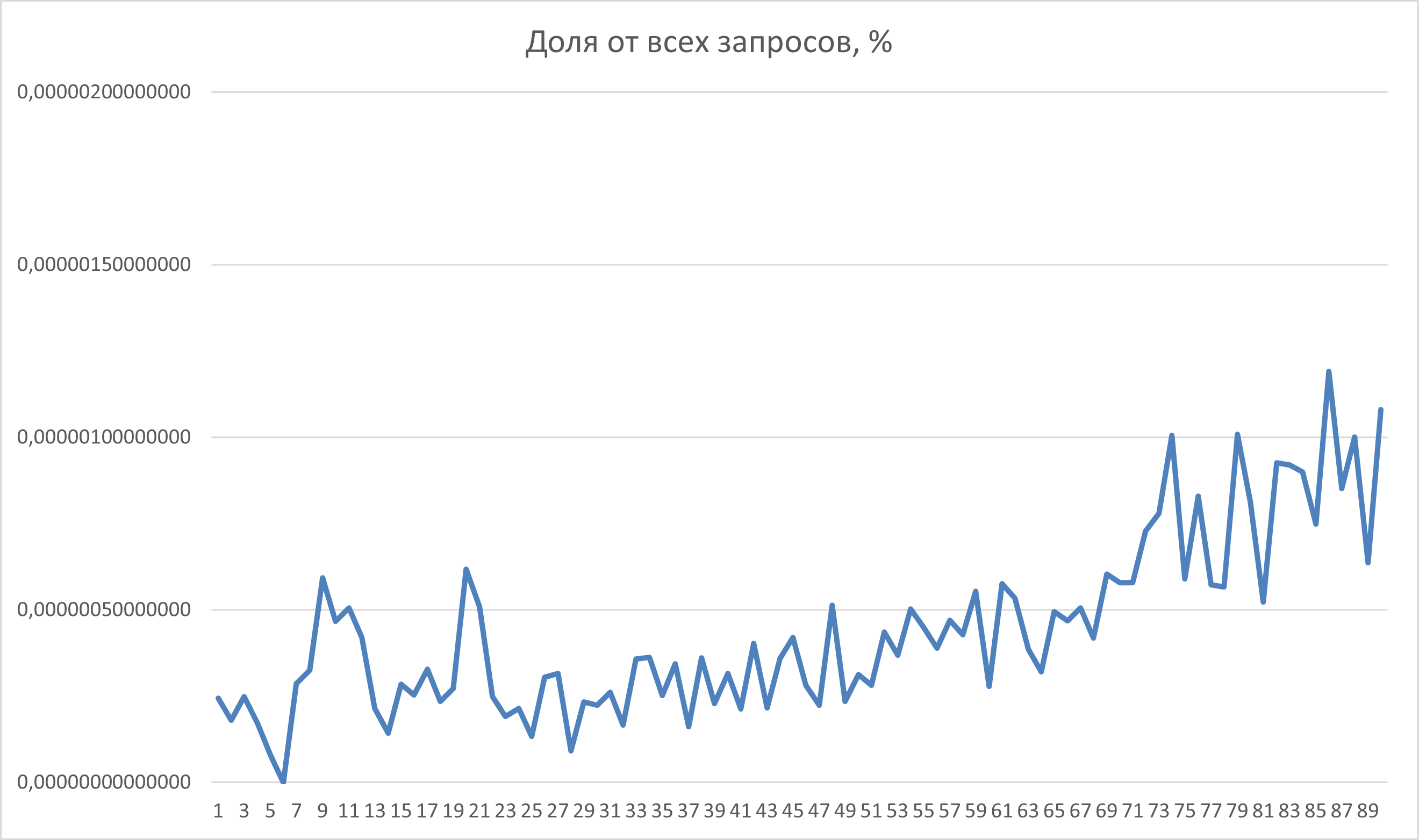 Для оценки динамики знания бренда Dotorg мы взяли статистику доли бренд-специфичных запросов «доторг» по отношению ко всем запросам в поисковике в Wordstat Яндекса. Суть подобной метрики — ваш бренд знают «до интернета», поэтому чем выше знание бренда, тем больше бренд-специфичных запросов, то есть тех, где включено название вашего бренда.