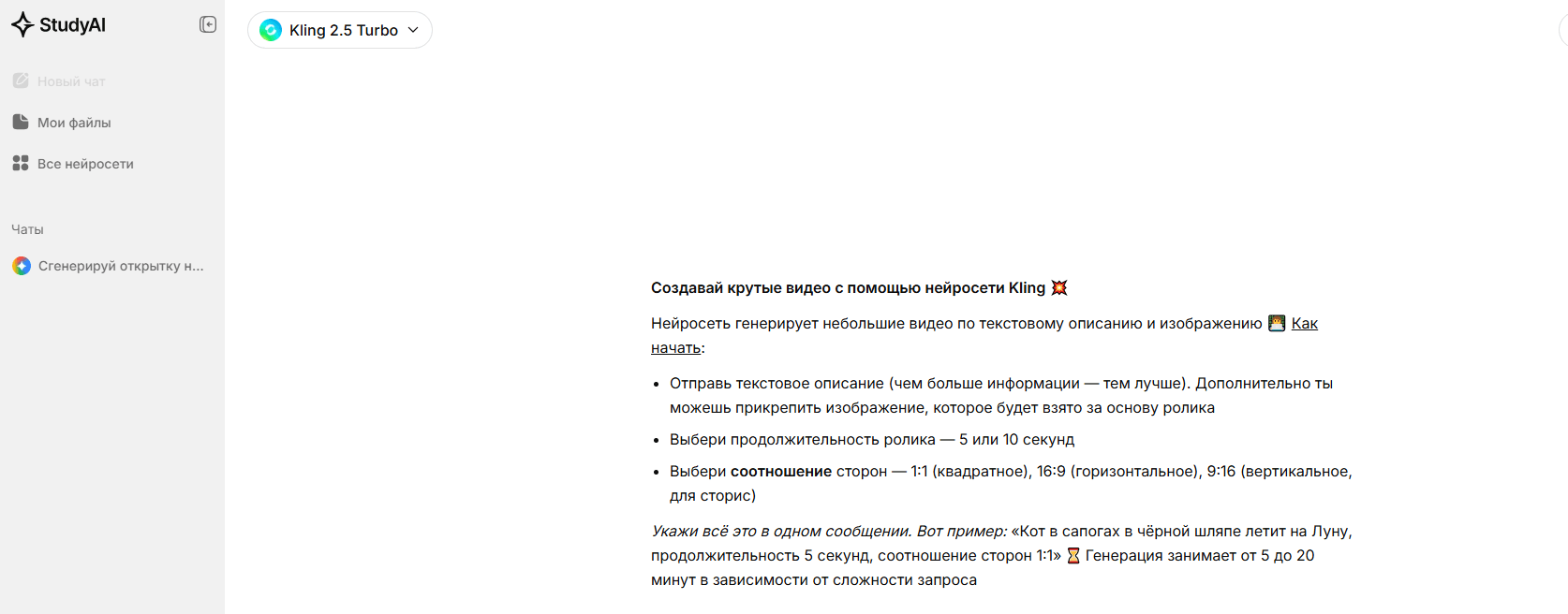 • Генерация может быть не быстрой: 5–20 минут на ролик.