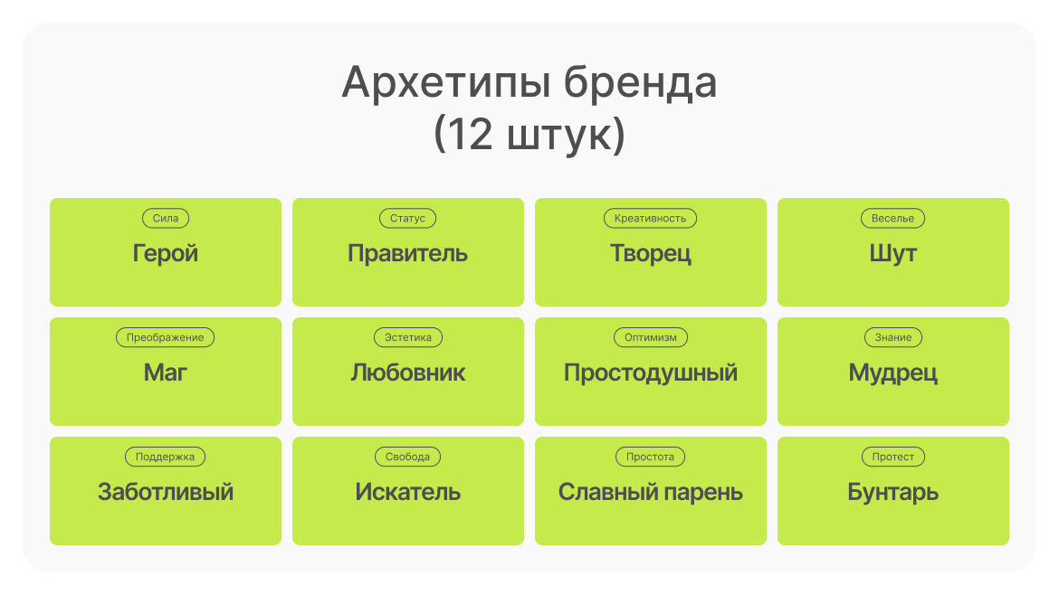 Вот с какими архетипами работает брендинг. Каждый задаёт свою тональность, мотивацию и способ говорить с аудиторией: