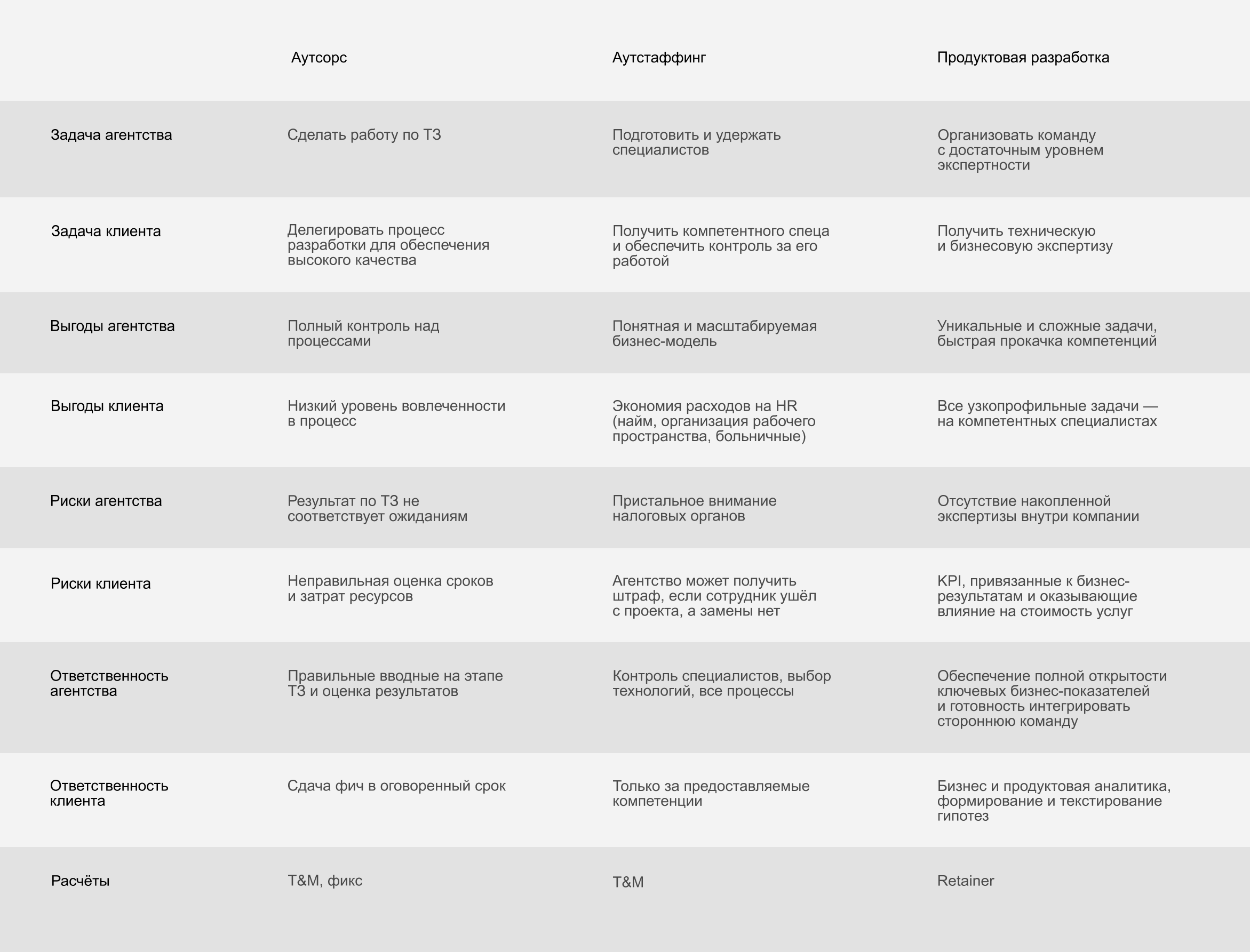 Формат подразумевает поиск и прокачку хороших специалистов. Ресурсы уходят на найм, удержание, мотивацию и грейдирование. Ответственность агентства — предоставить адекватного человека с релевантным опытом.
