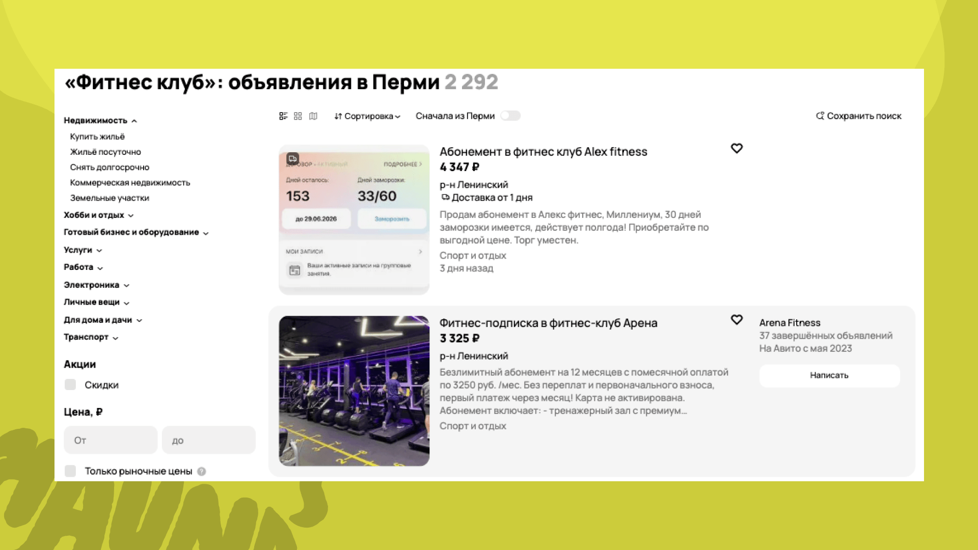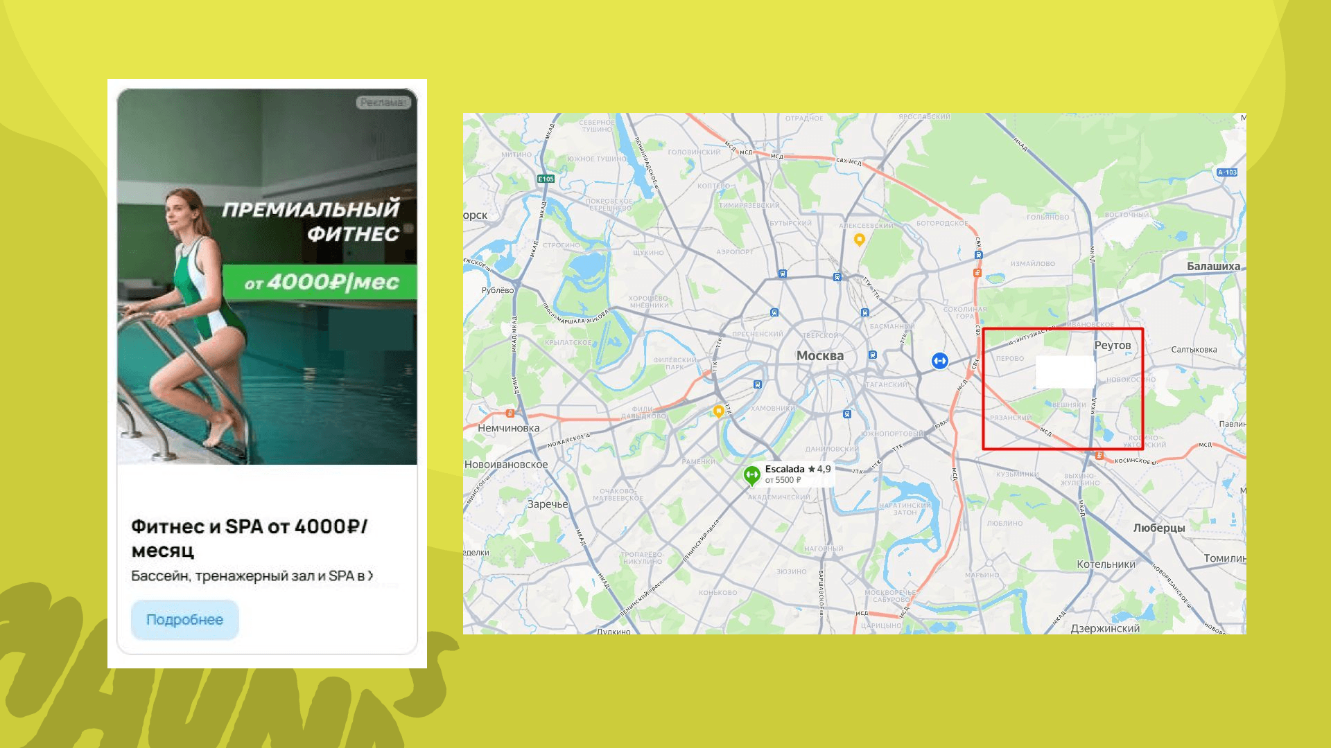 Люди приходят на Авито покупать, а не прокрастинировать в ленте. Это не холодный таргет из серии «авось в марте пойду и начну худеть в тренажерке». Это теплый поиск: если человек вбил «фитнес-клуб», значит хочет тренироваться прямо сейчас. Ну, или хотя бы на следующей неделе.