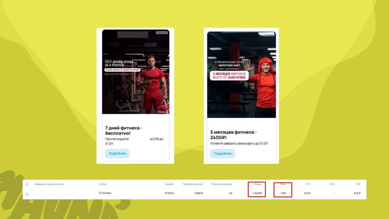 Мы протестировали Avito.Ads на пяти клубах в Екатеринбурге, Питере, Москве и Иркутске. Их усредненные показатели мы уже демонстрировали в самом начале, поэтому ниже — более сочные подробности.