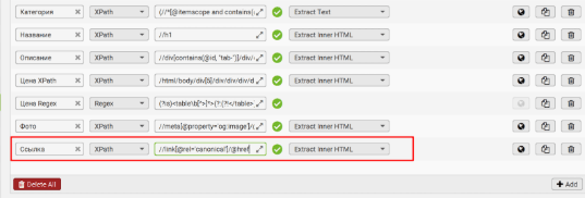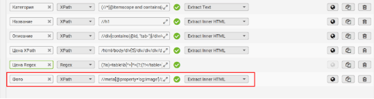 В поле выбора данных укажите “Extract Inner HTML” - и далее используйте это значение для всех остальных полей, если не указано иное.