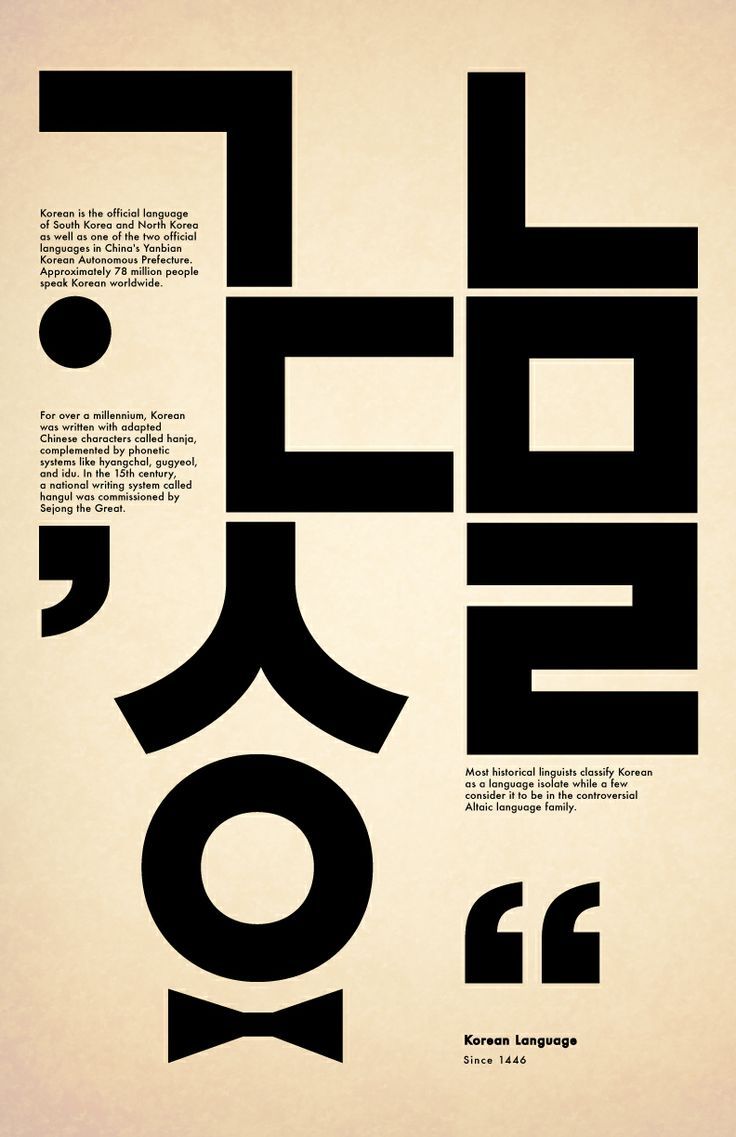 Типографика как выразительный инструмент. В корейском графическом дизайне типографика часто становится центральным элементом композиции. Хангыль — корейская письменность. Благодаря своей геометричности она легко трансформируется, масштабируется и используется как самостоятельная визуальная форма. Шрифт здесь не обслуживает изображение, а формирует его.