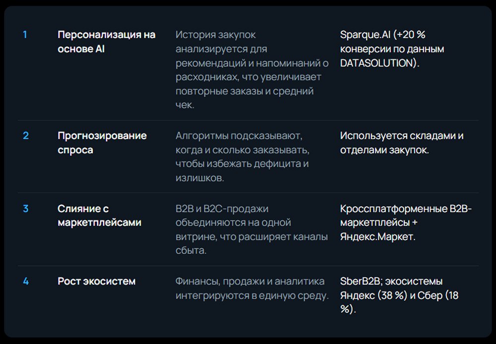 В России пионерами стали «Сима-ленд» (с оптовыми заказами онлайн), «ТехноНиколь» (цифровая платформа для дилеров), «Металлинвест» (B2B-кабинет с интеграцией ERP).