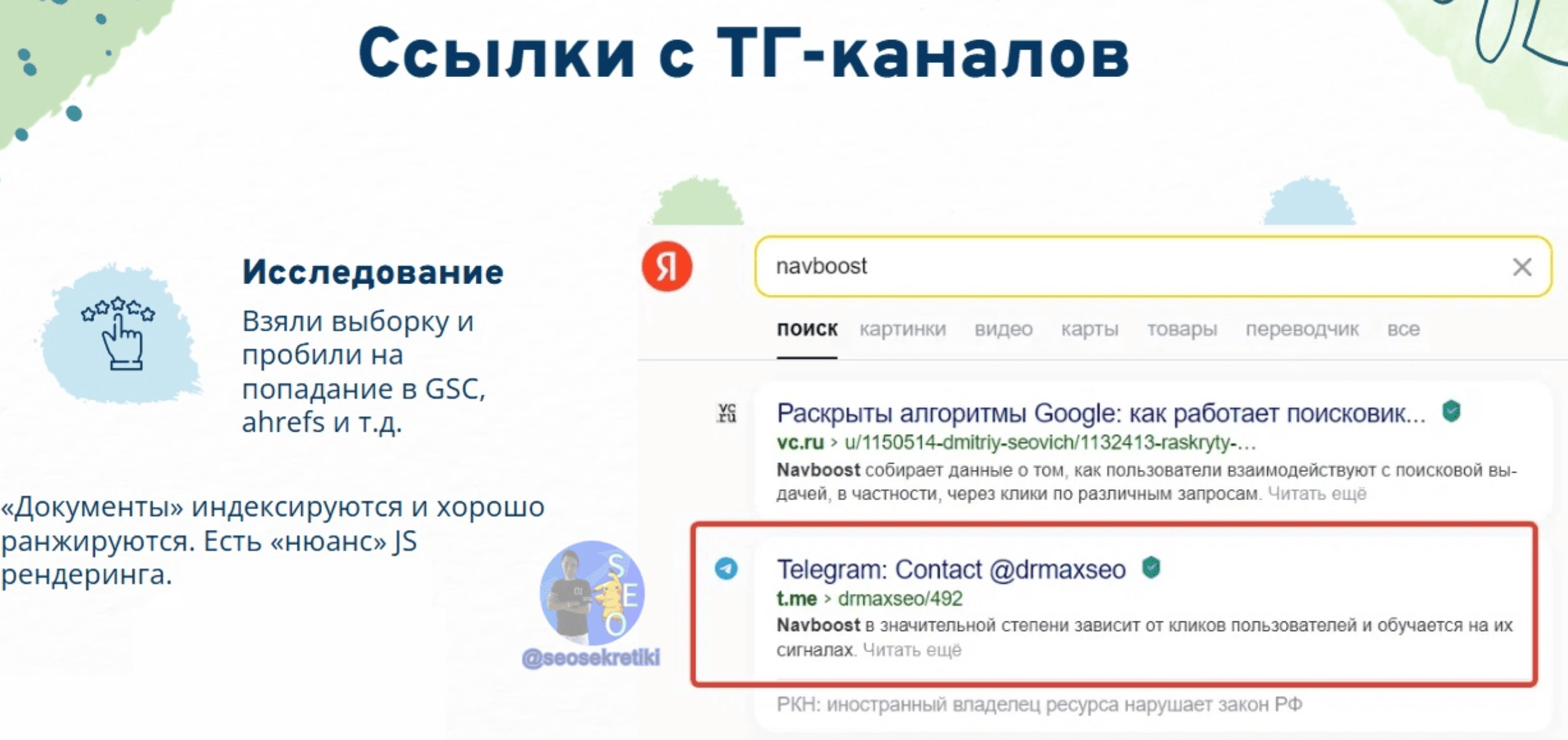 Вкратце, суть исследования: взяли небольшую выборку и проверили попадание ссылок в GSC, ahrefs и другие анализаторы. Также, изучили трафик из ТГ по Аналитиксу и Метрике. По итогу, было понятно, что это все дело индексируется, попадает в GSC и анализаторы, плюс хорошо ранжируется, особенно, если идет речь о брендовых запросах и информационке, это тоже было очевидно. Было много интересных нюансов, например, по индексации страниц с GET-параметрами, отдельных постов и комментариев под постами, а также, про влияние JavaScript на рендеринг этих страниц.