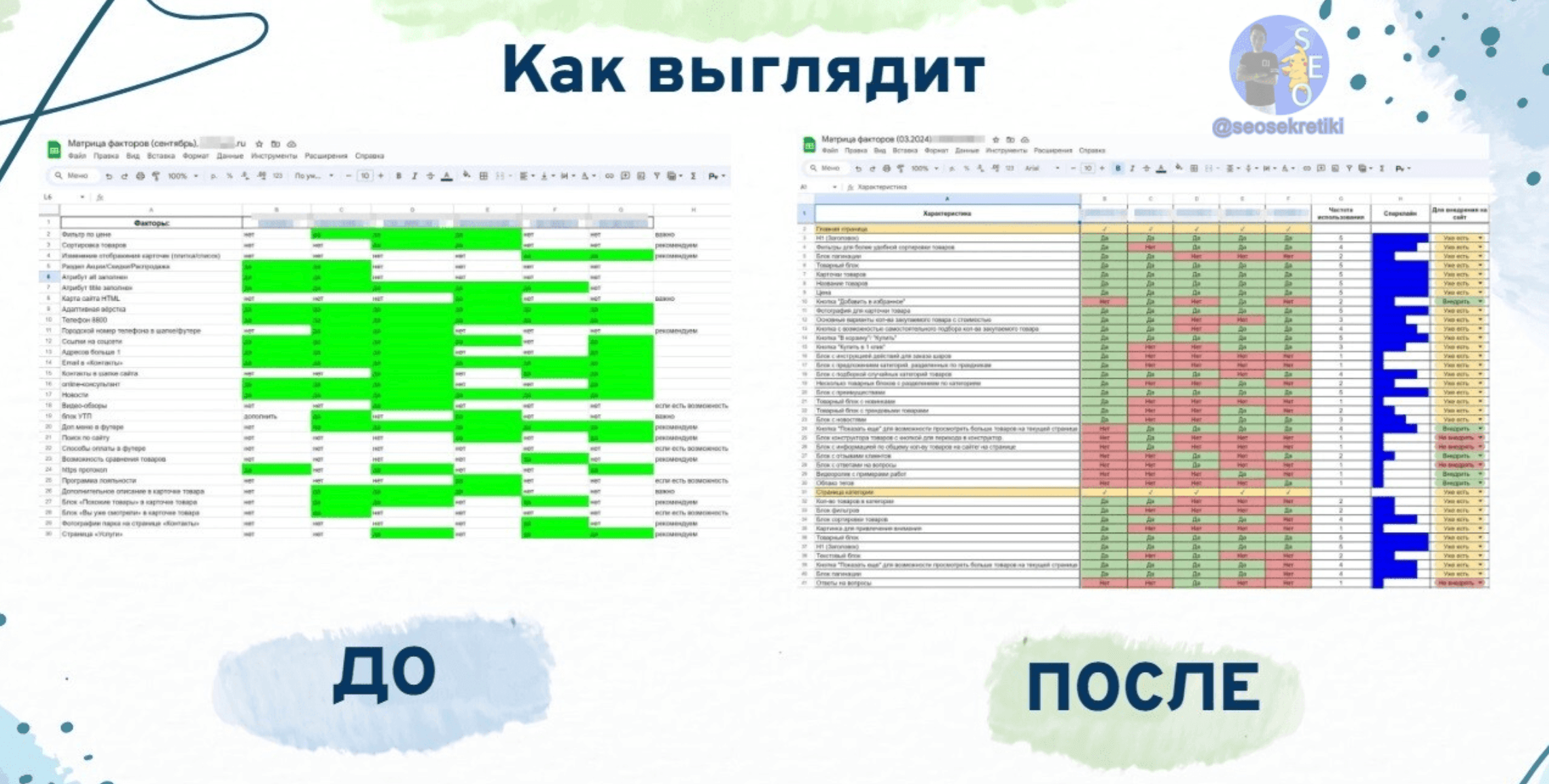 Пример, как у нас в агентстве выглядит матрица с чек-листом по КФ (до и после).