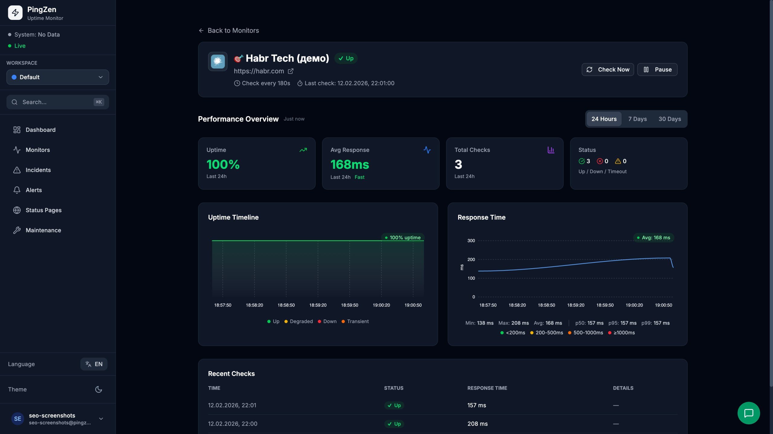 Для тех, кто хочет быть прозрачным перед клиентами, PingZen позволяет создать красивую статус-страницу в один клик: