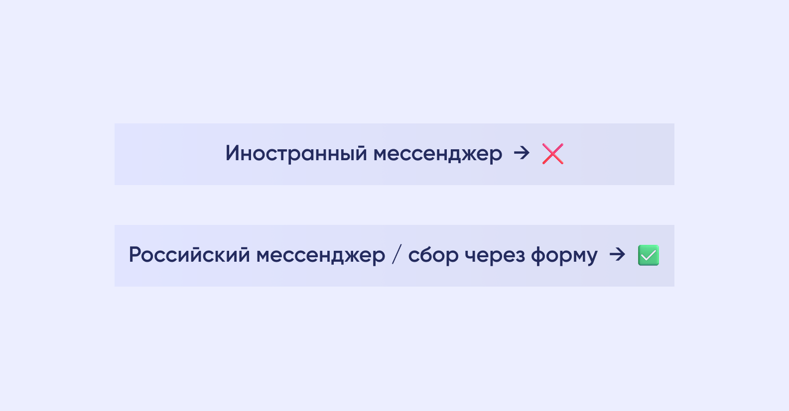 Как уточняет юрист Оксана Потанина, «специальная регистрация в Роскомнадзоре не требуется, но подразумевается, что если идет обработка и сбор персональных данных, компания должна быть уже зарегистрирована как оператор персональных данных. И при использовании иностранных мессенджеров должна быть отметка о трансграничной передаче данных».