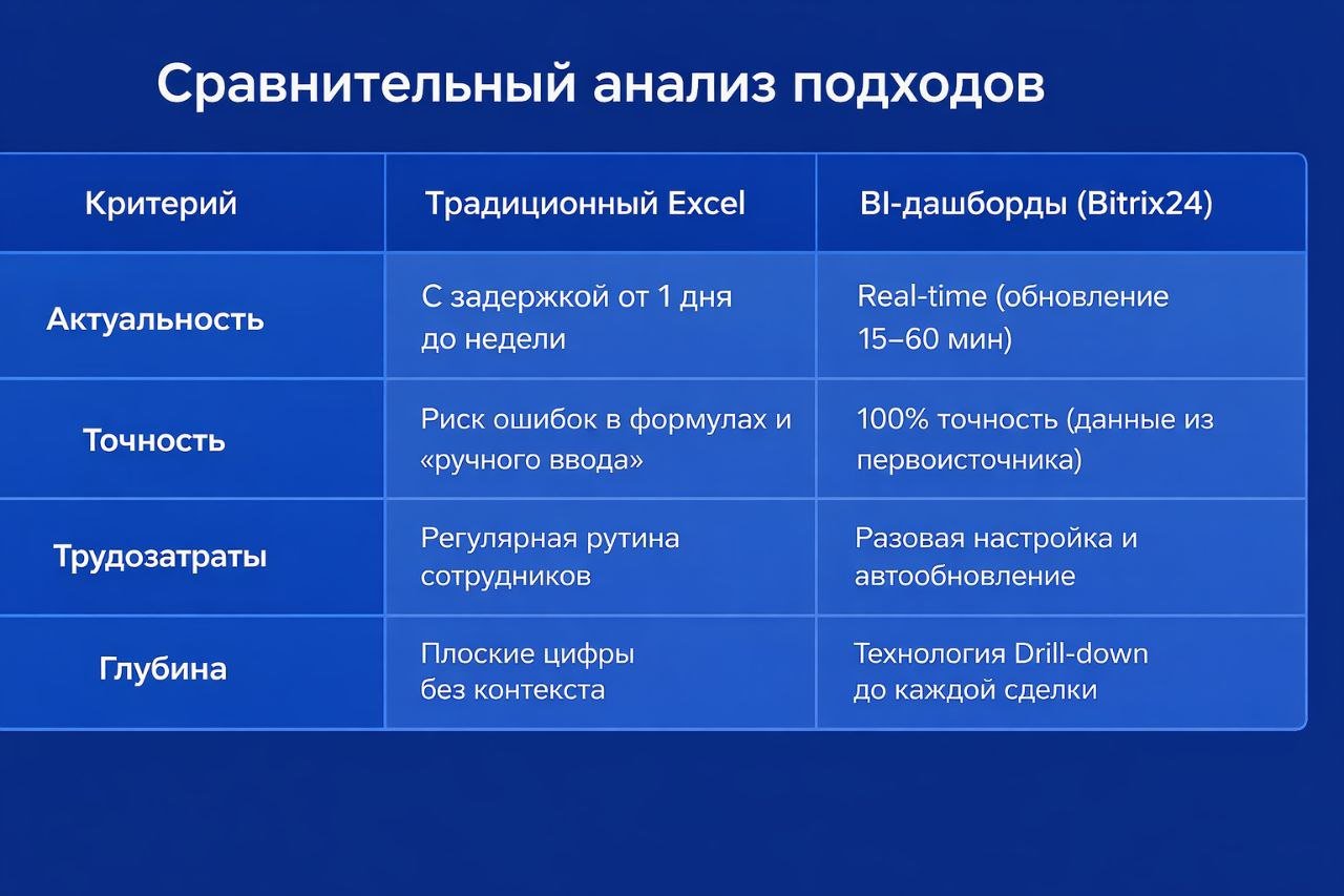 Замена Excel на автоматические дашборды в Битрикс24 это не просто смена интерфейса. Это переход к культуре Data-Driven Management (управления на основе данных). В 2026 году это единственный способ сохранить «трезвый взгляд» на бизнес в условиях высокой турбулентности.