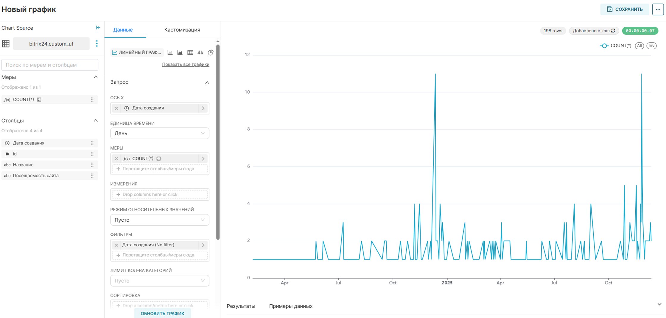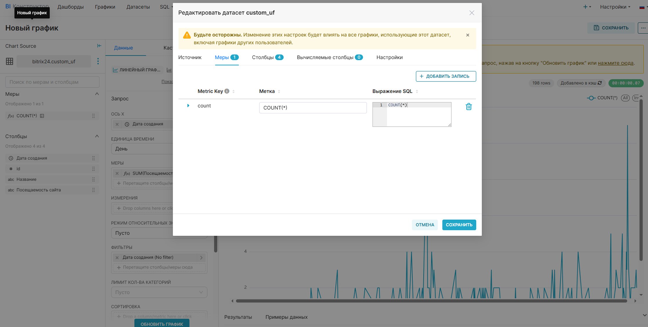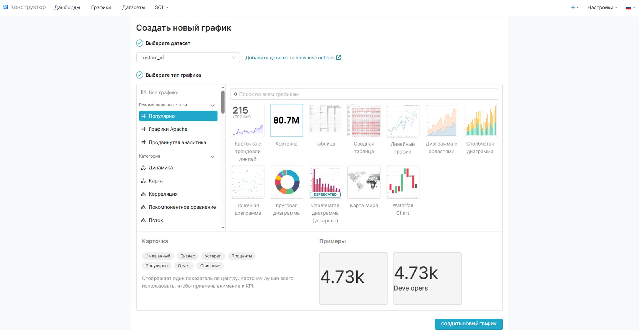 Перейдите в раздел графиков и добавьте новый. Выберите кастомный датасет и нужный тип графика. Настройте измерения и меры, после чего сохраните график.
