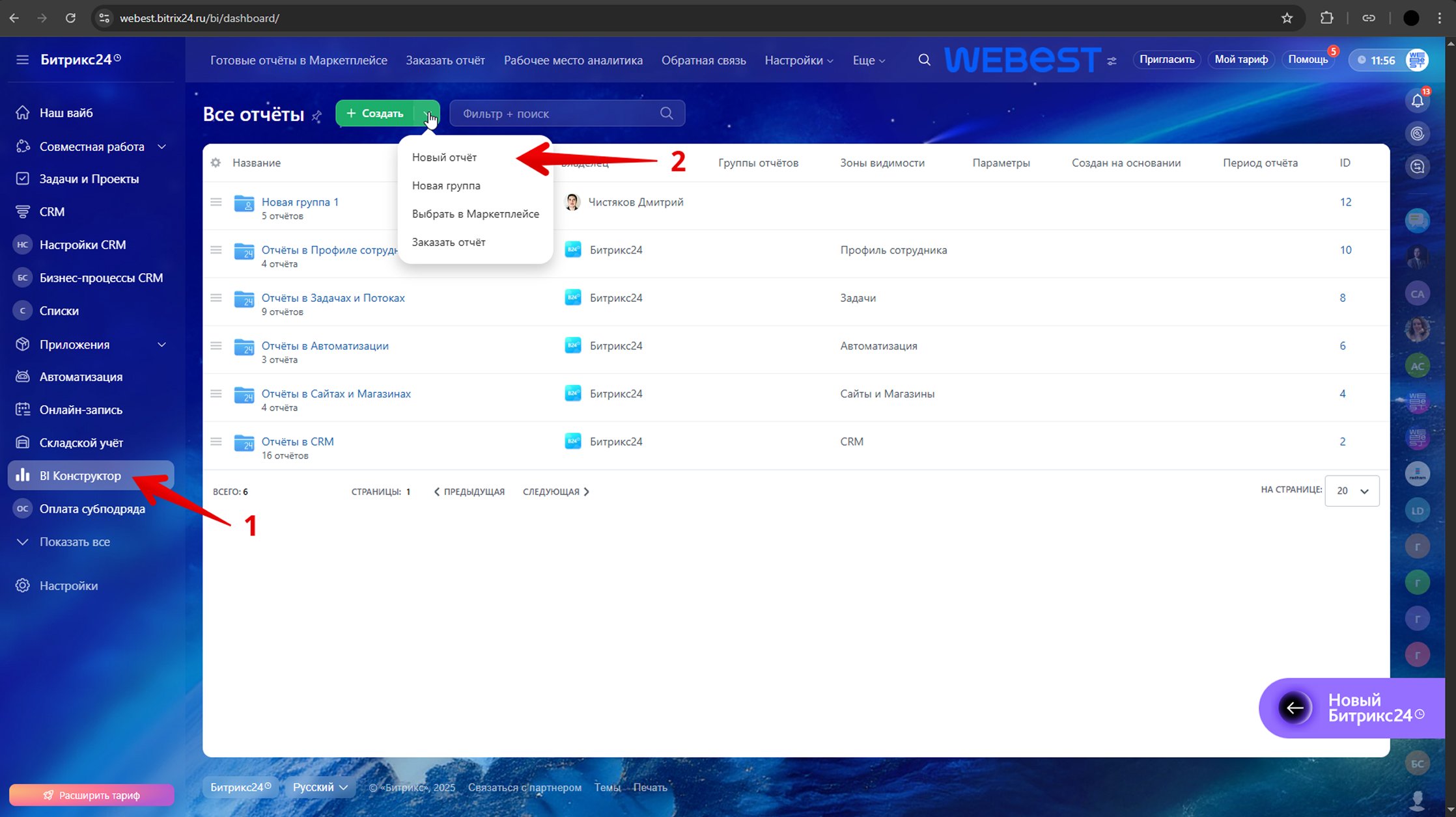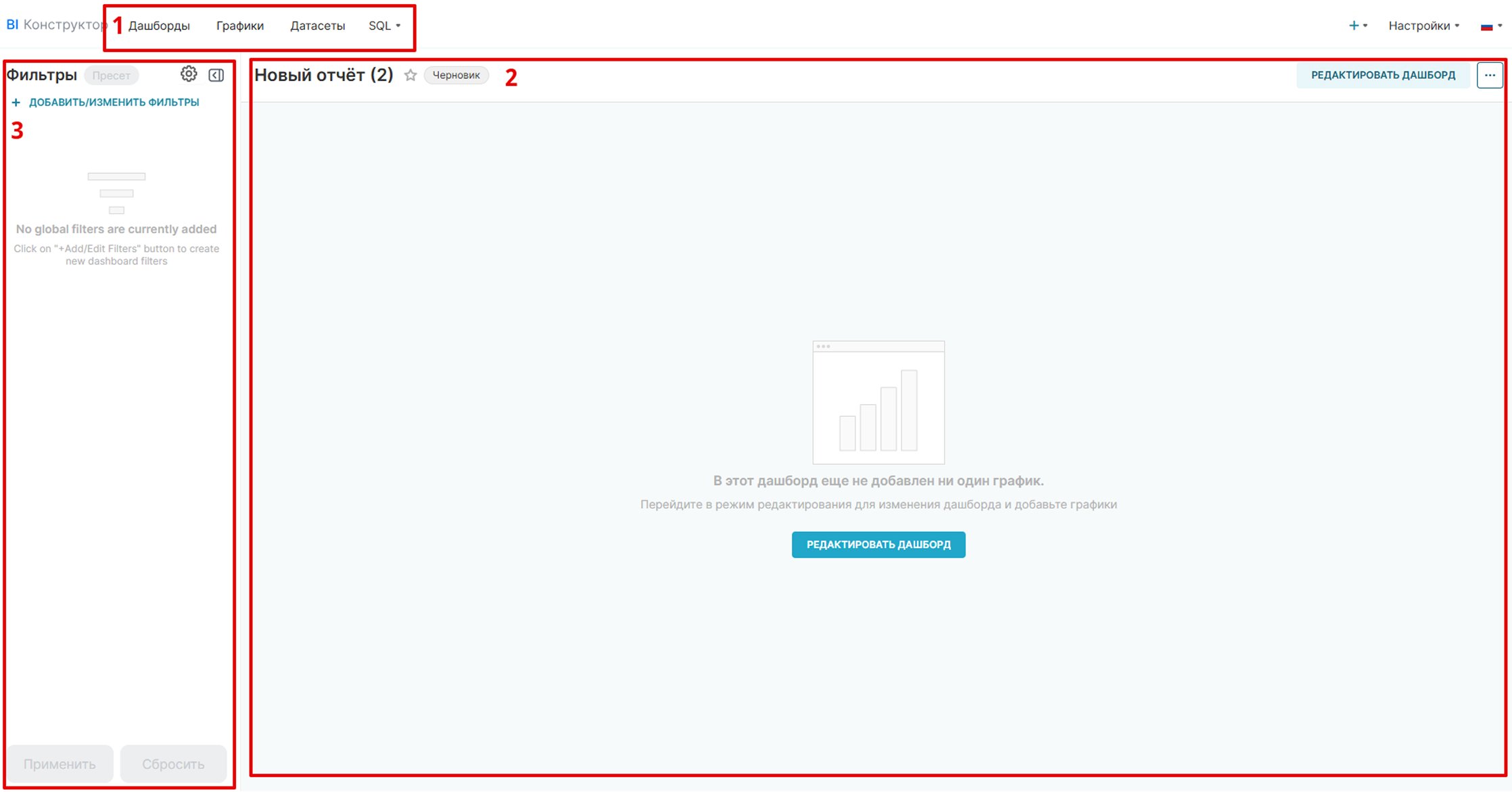 Перейдите в раздел «BI Конструктор» и создайте новый дашборд: задайте название, при необходимости выберите группу (папку с отчетами) и настройте параметры. Для детального изучения возможностей – документация здесь.