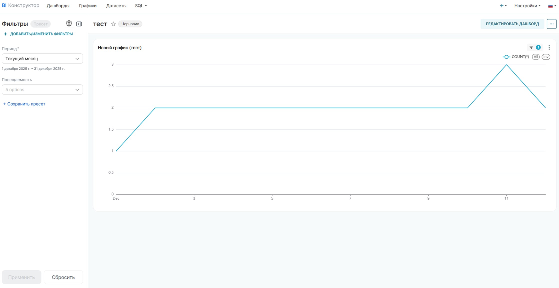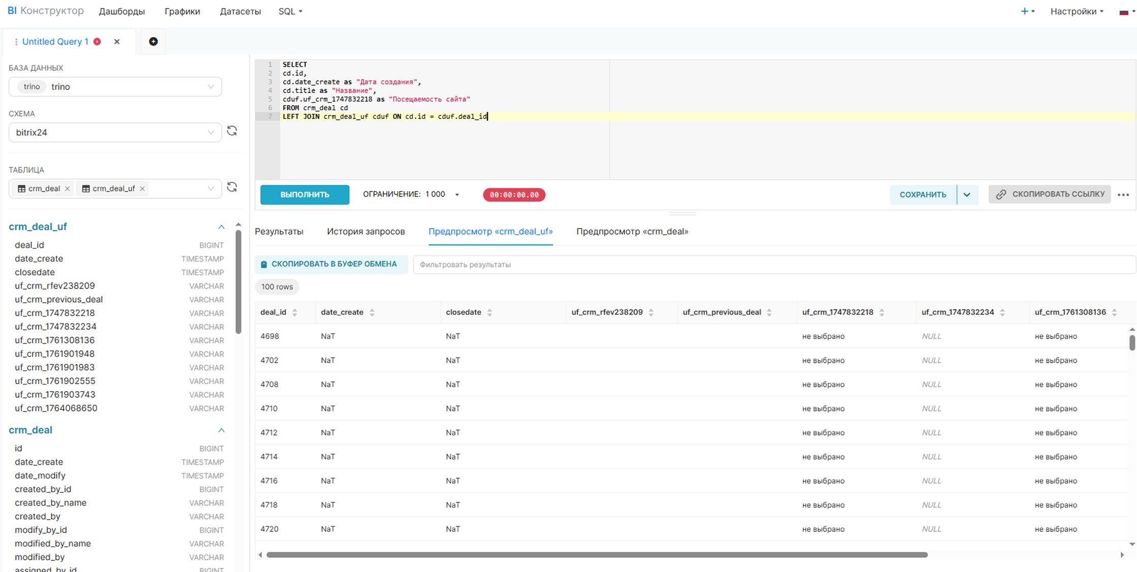 Далее перейдите в SQL и изучите доступные таблицы. Определите, из каких таблиц будете получать данные, и напишите SQL-запрос для кастомного датасета. Я для примера создаю график посещаемости. При необходимости используйте JOIN для объединения таблиц сделок, пользовательских полей, лидов и других сущностей.