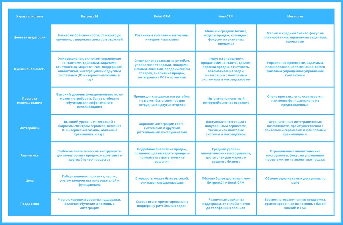 Вы хотите, чтобы ваши продажи взлетели, а клиенты – летали от восторга? Тогда вам нужна CRM-система, идеально подходящая для вашего бизнеса. Но с таким выбором на рынке, как Битрикс24, Retail CRM, Amo CRM и Мегаплан, как не запутаться?
