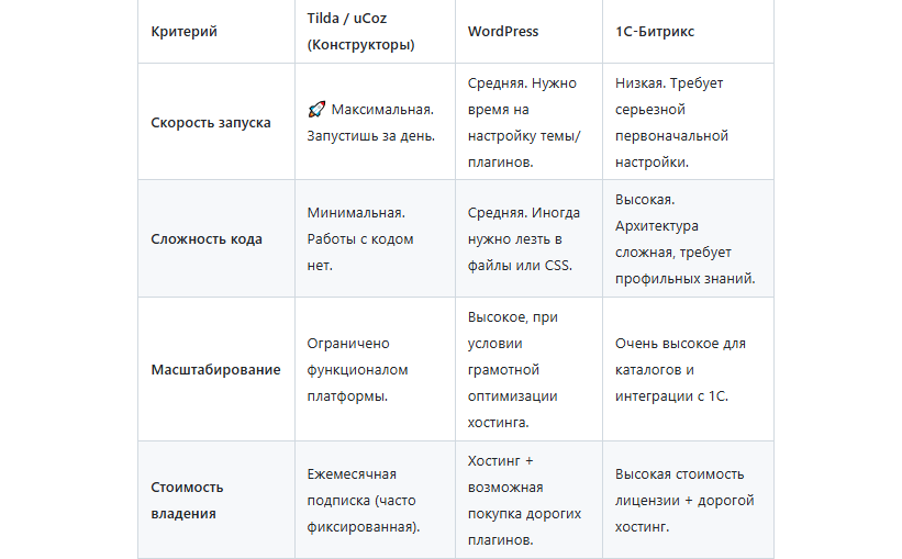 Помни: конструктор - это быстрый, красивый автомобиль, идеально подходящий для городской езды. CMS вроде WordPress - это внедорожник, который может заехать куда угодно, но требует регулярного ТО. А Битрикс - это грузовик, созданный для перевозки очень тяжелых и специфических грузов. Выбирай, что тебе везти! 😉