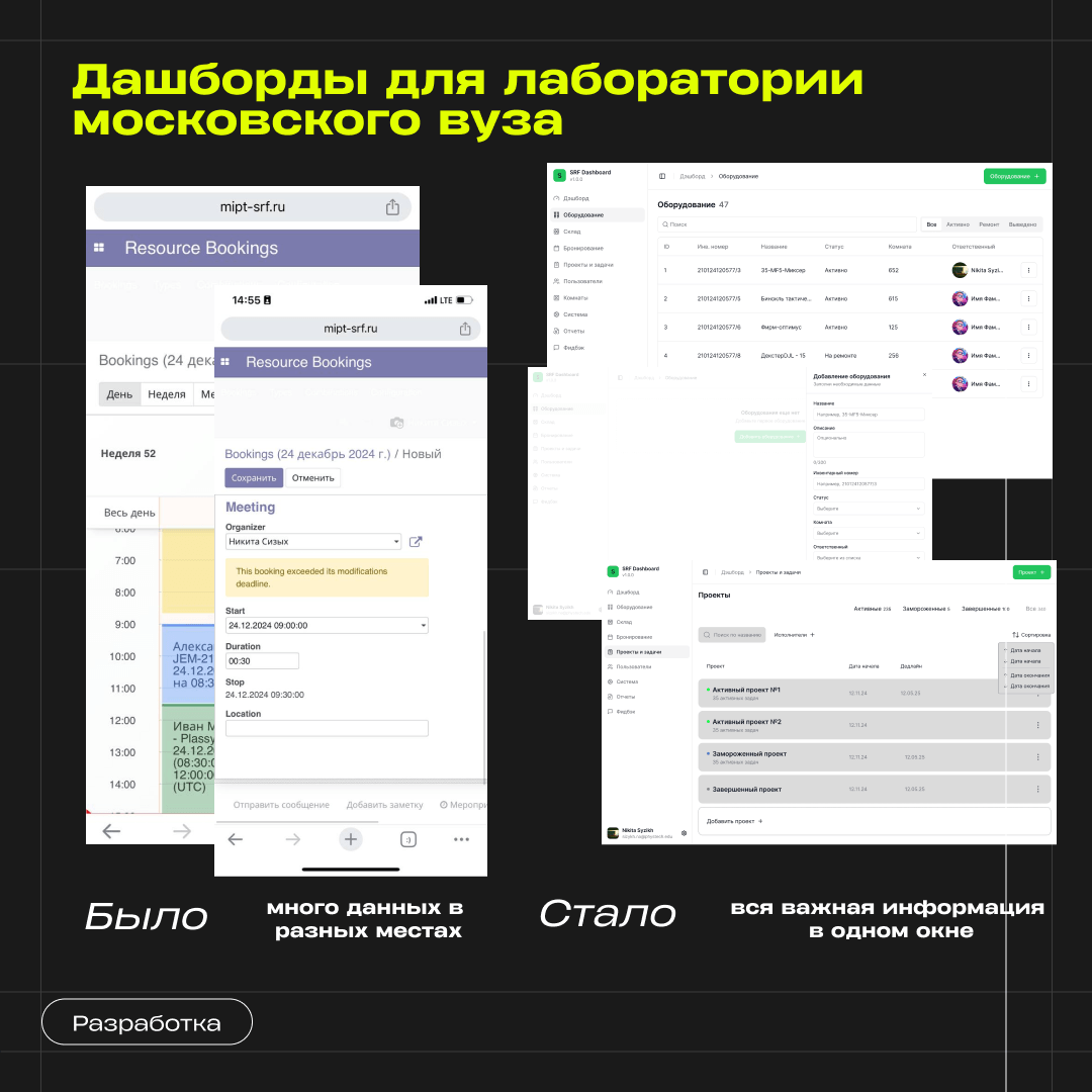 Мы разработали систему, которая:✔️ Отображает все бронирования и доступность оборудования в одном интерфейсе.✔️ Фиксирует движение расходных материалов и отправляет уведомления при низких запасах.✔️ Интегрирована с Telegram для авторизации и уведомлений. В будущем — подключение API-мониторинга оборудования.