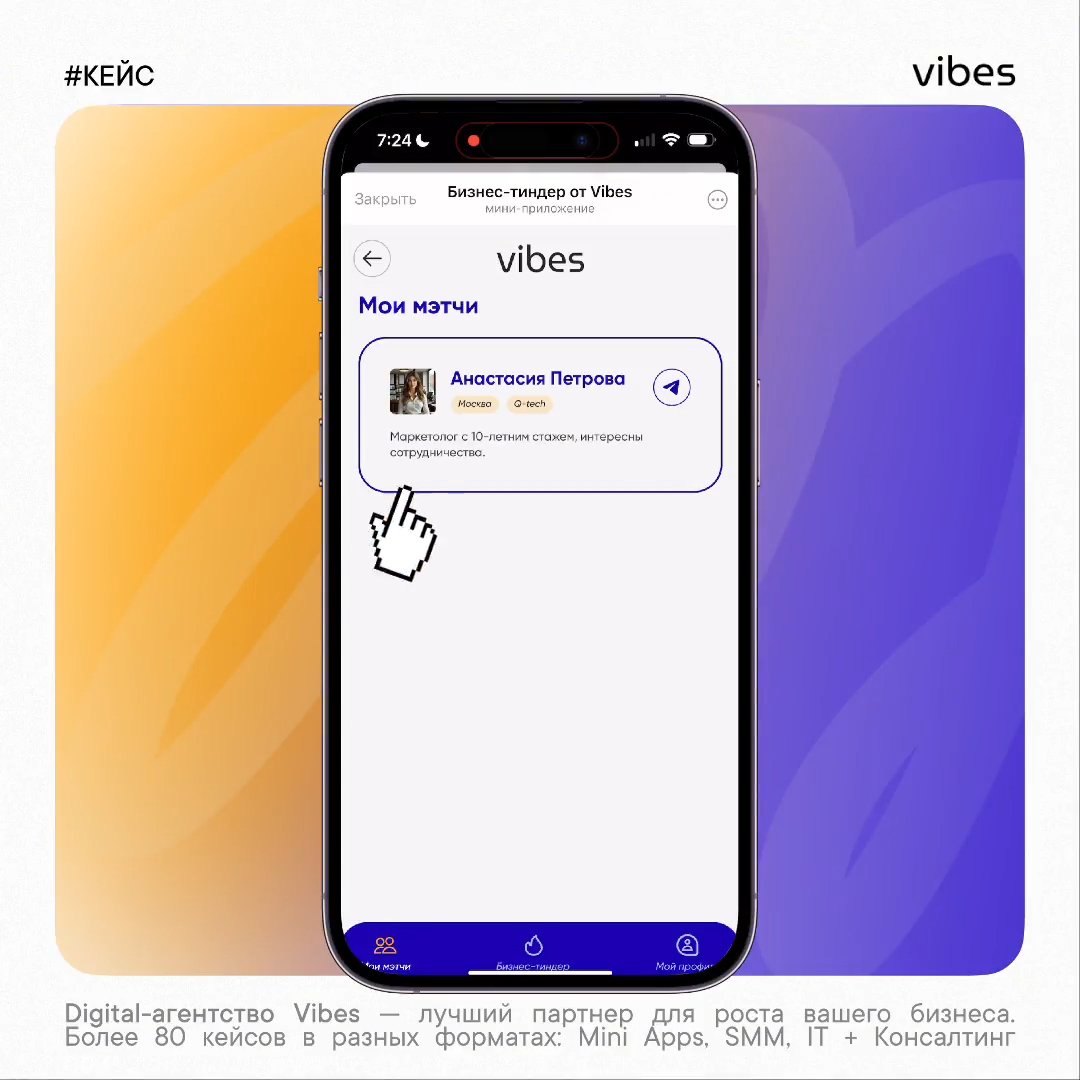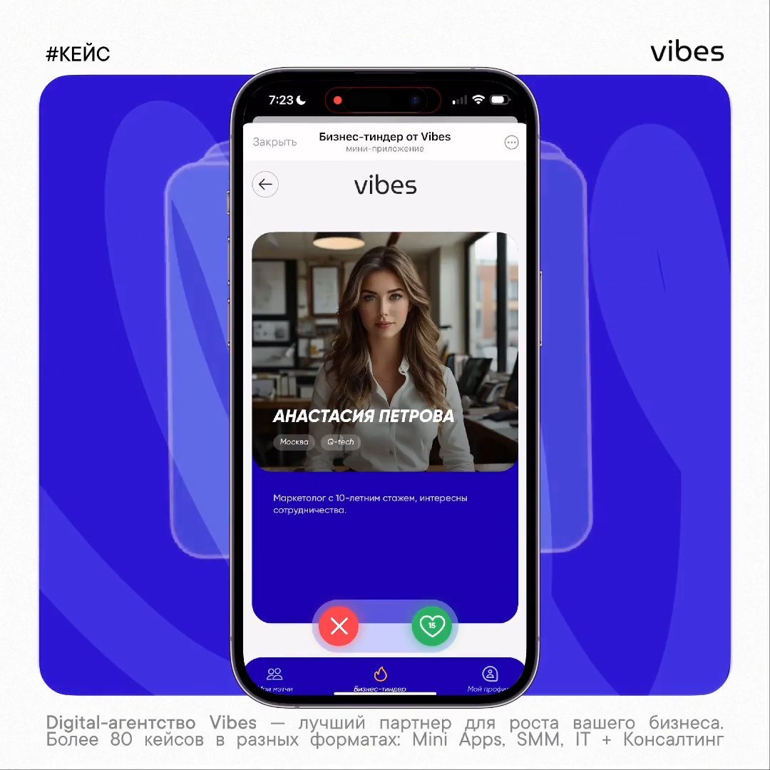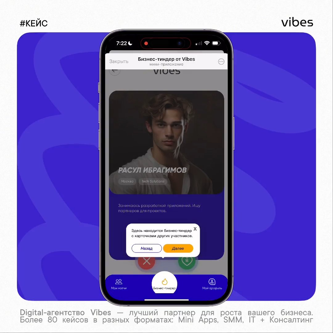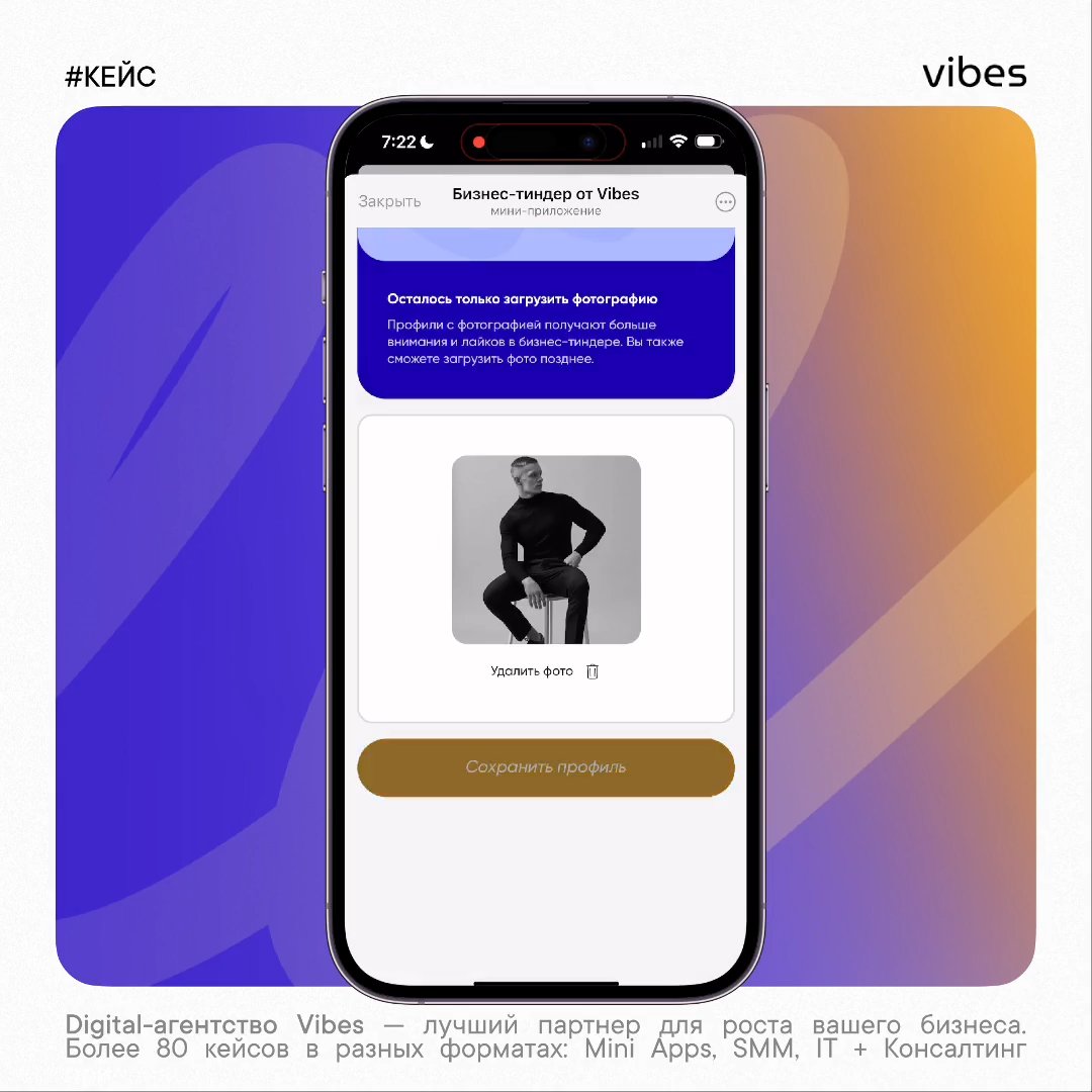Хотите бизнес-тиндер под ваши цели и задачи? Или объединить целое сообщество в приложении? Пишите @vibes_manager в Telegram или на email hello@vibes.band – расскажем о возможностях.