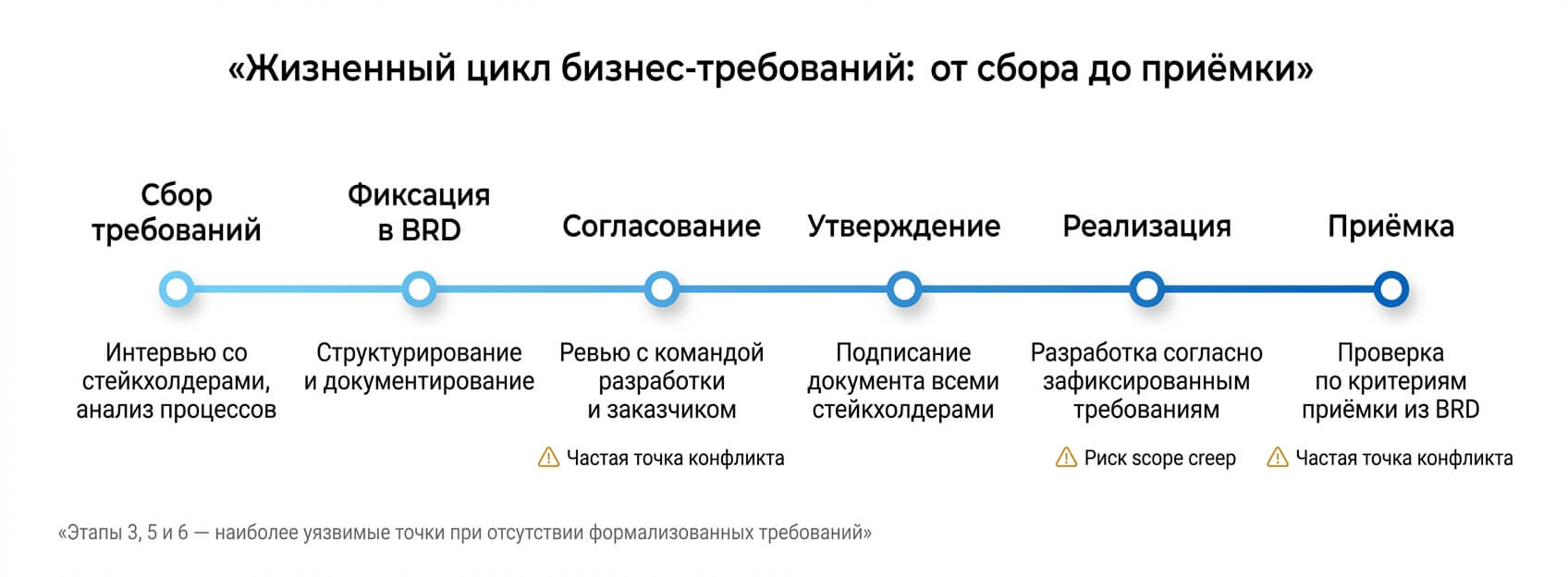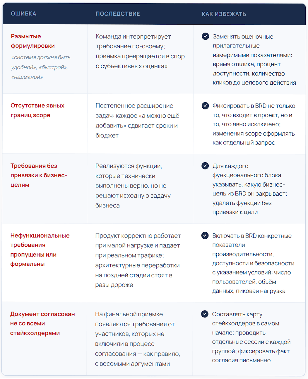 🔍 Из практики заказной разработки: Среди семи блоков BRD чаще всего пропускают не функциональные требования — их как раз обычно прописывают подробно. Наиболее уязвимые блоки: нефункциональные требования и границы проекта. Первые кажутся «техническими», вторые — «очевидными». Именно эти два пропуска чаще всего становятся источником конфликтов на приёмке и архитектурных переработок в середине проекта.
