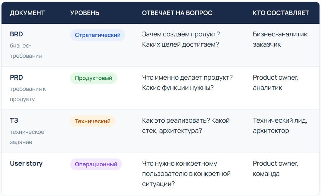 В российской практике понятие «бизнес-требования» нередко смешивают с техническим заданием (ТЗ) или с документом о требованиях к продукту (PRD). Это разные уровни одной иерархии, и путаница между ними обходится дорого: команда разработки получает либо слишком общий документ, из которого непонятно, что реально строить, либо избыточно детальный — с техническими решениями, принятыми раньше, чем сформулированы цели. BRD отвечает на вопрос «зачем и что», PRD — «что именно и для кого», техническое задание — «как именно реализовать».