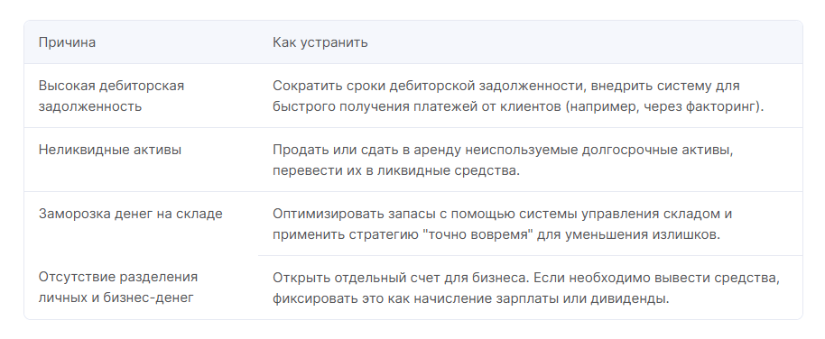 Решение таких проблем заключается в улучшении управления денежными потоками, повышении эффективности операционной деятельности и установлении прозрачных финансовых процессов, чтобы избежать подобных ситуаций в будущем.