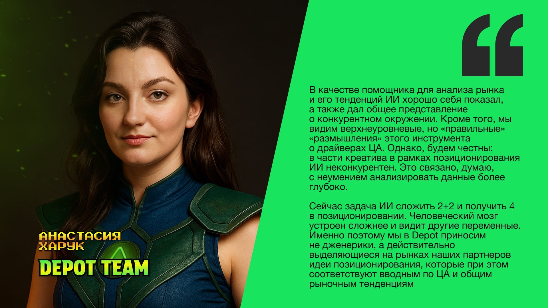 ИИ легко справляется с огромными массивами данных в короткий срок, постоянно учится и часто подкидывает интересные мысли в рамках «размышлений на тему», а вот фактурности идей и разнообразия в креативе ему пока не хватает, все финальные результаты получаются довольно поверхностными и неконкурентоспособными. Поэтому мы в команде рассматриваем программы ИИ как технических помощников, которые оптимизируют процессы и частично упрощают работу человеческих юнитов Depot. Например, для этой статьи ИИ помогали нашему дизайнеру стилизовать фотокарточки команды под Мортал Комбат :)