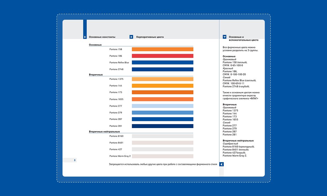 Кроме описания концепции, гайдлайн содержит названия используемых шрифтов, коды фирменных цветов, принципы работы с графикой. А также варианты неправильной интерпретации фирменного стиля и его элементов.