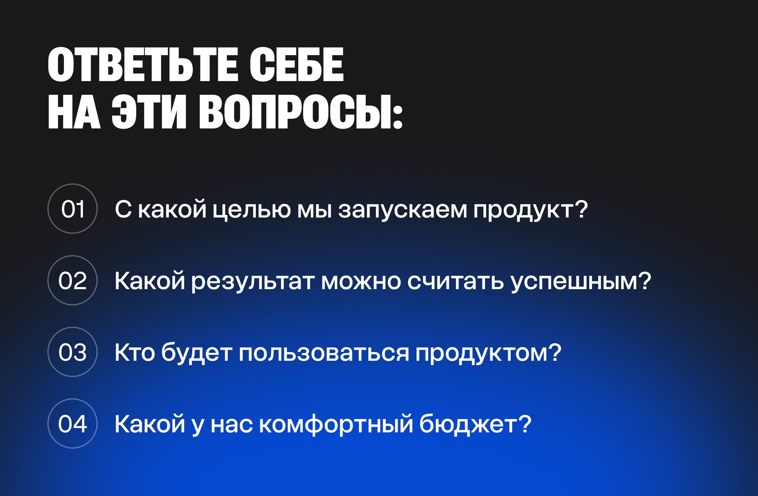При этом есть проекты, которые идут совсем иначе. В них клиент ещё до первого созвона ответил себе на несколько базовых вопросов: