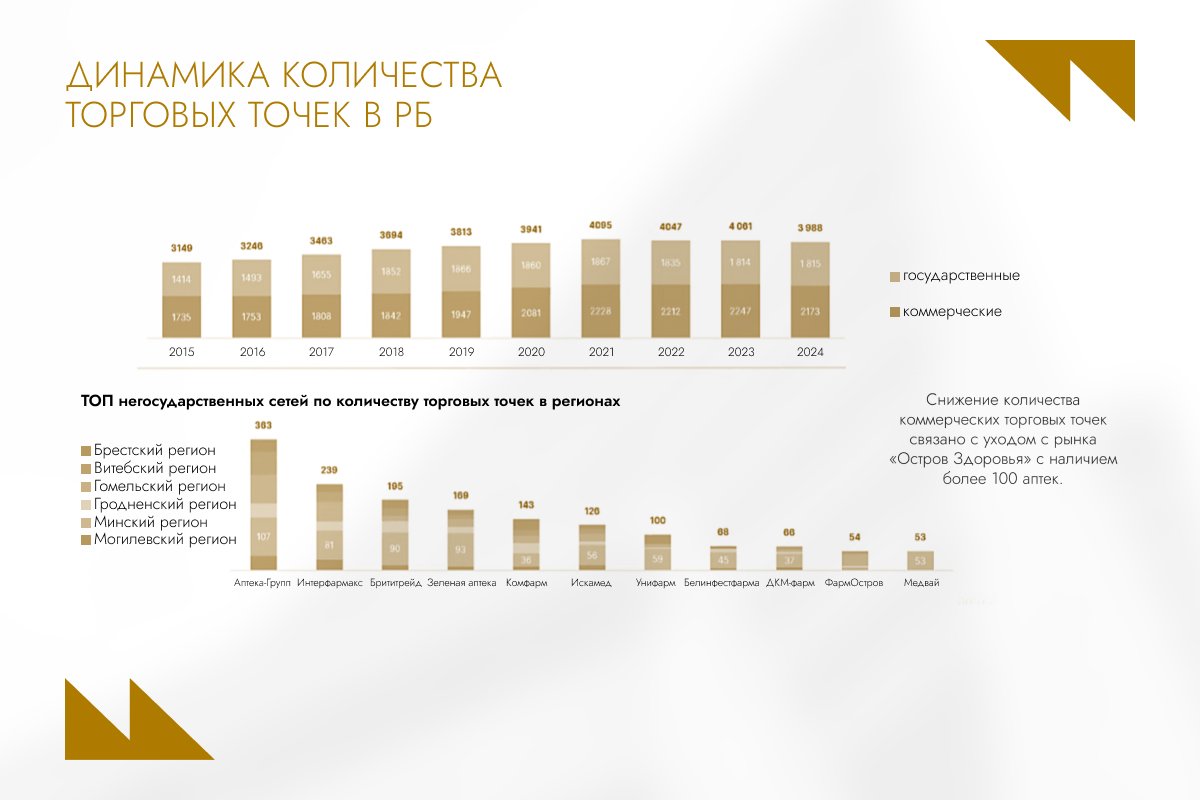 Ведущие позиции занимают частные сети: «Аптека-Групп», «Интерфармакс», «Брититрейд». Всего в стране работает 35 фармпредприятий, при этом 8 из топ-10 по объему продаж — белорусские. Лидеры: Искамед, Белфарм, Лекфарм, Боримед, Фармлэнд.