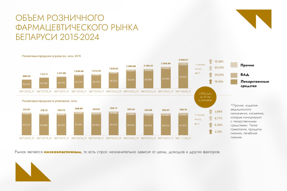 Белорусский рынок демонстрирует устойчивый рост как в рублях, так и в упаковках. Особенно быстро развивается сегмент БАДов — витамины, минеральные добавки и гиполипидемические средства входят в число самых востребованных. Ценообразование чувствительно к колебаниям валют и логистическим расходам, однако доля лекарств в потребительской корзине населения остается стабильной — около 4%.