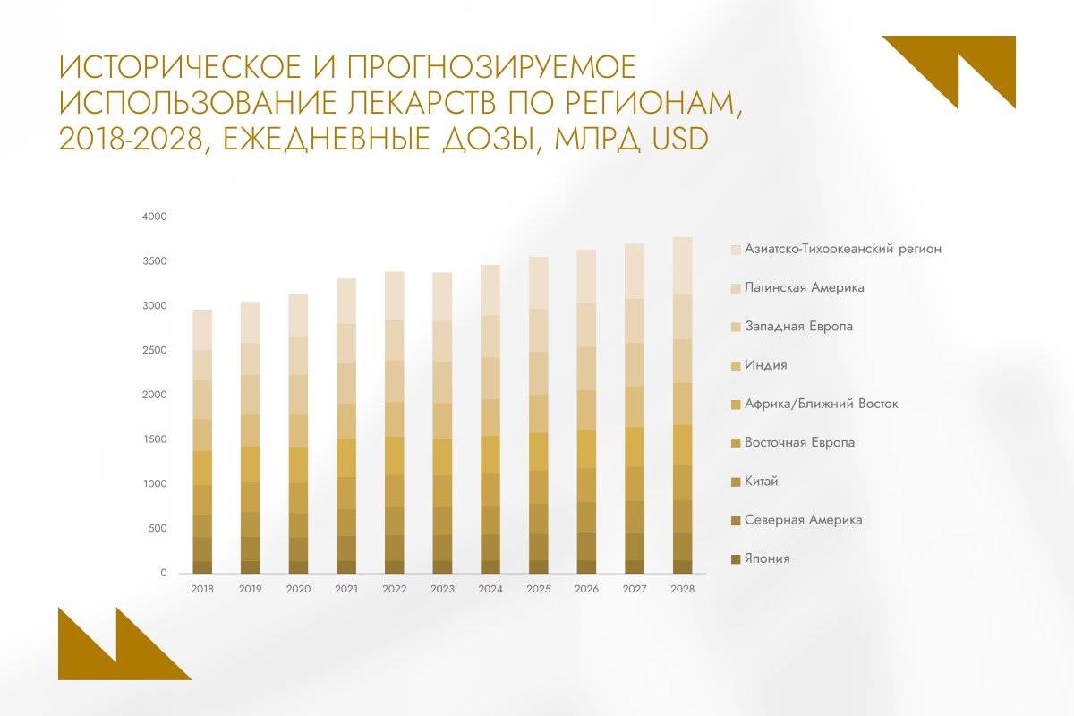 В целом, к 2028 году в Северной и Латинской Америке, Восточной и Западной Европе, а также в Африке и на Ближнем Востоке расходы на фармацевтические товары вырастут более чем на 30%. Это говорит не только о росте объемов потребления, но и о смещении спроса в сторону более дорогостоящих, высокотехнологичных препаратов.