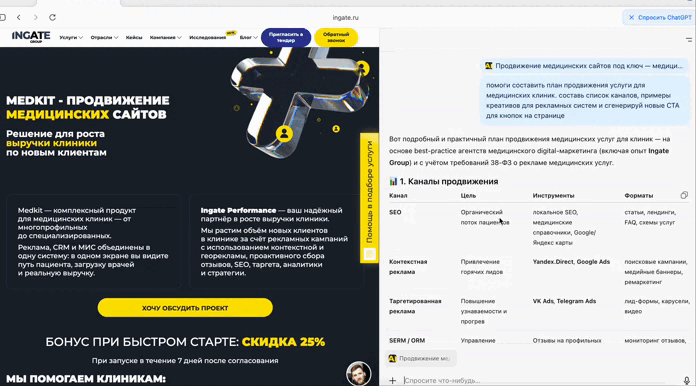 Мы выбрали услугу нашего агентства Medkit, которая подразумевает комплексное продвижение для медицинских клиник под ключ, в качестве продукта для рекламной кампании. Попросили у нейросети составить план продвижения услуг со списком каналов и примерами креативов для рекламных систем, а также запросили переписать CTA для кнопок на лендинге нашей услуги.