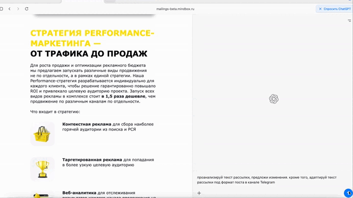Мы открыли в Atlas черновик подготовленной рассылки и попросили нейросеть проанализировать, что в ней хорошо, а что плохо. Также ChatGPT должен был предложить улучшения для рассылки и адаптировать информацию для поста в Telegram-канале.