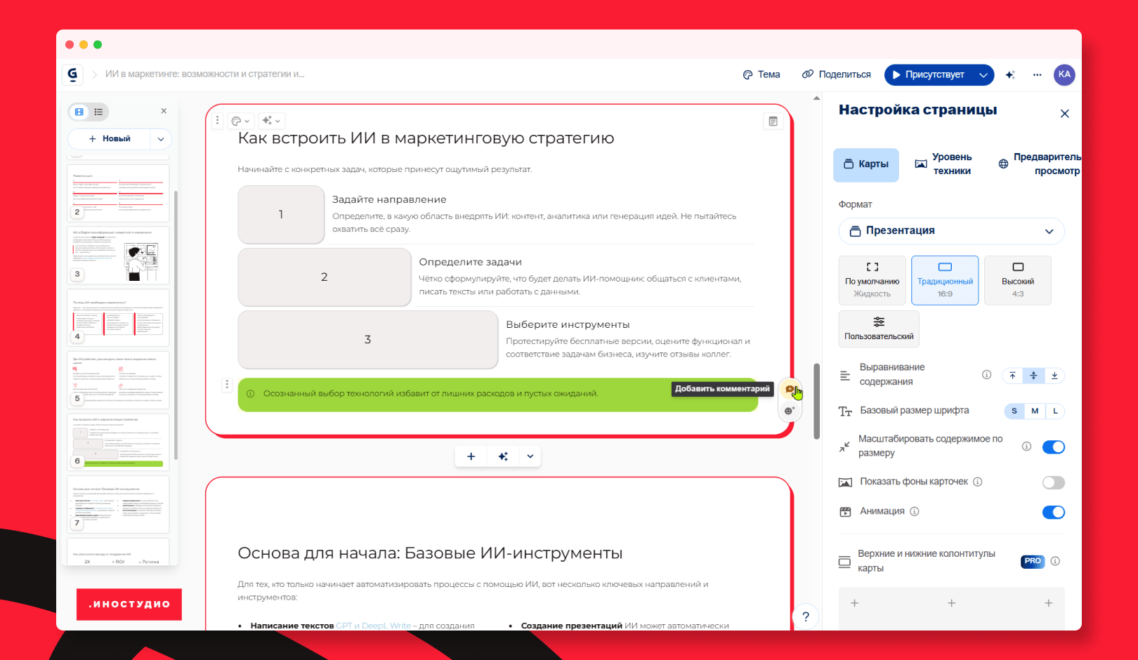 ИИ поможет составить макет, структурировать информацию по слайдам и даже сделать простое визуальное оформление в фирменном стиле компании.