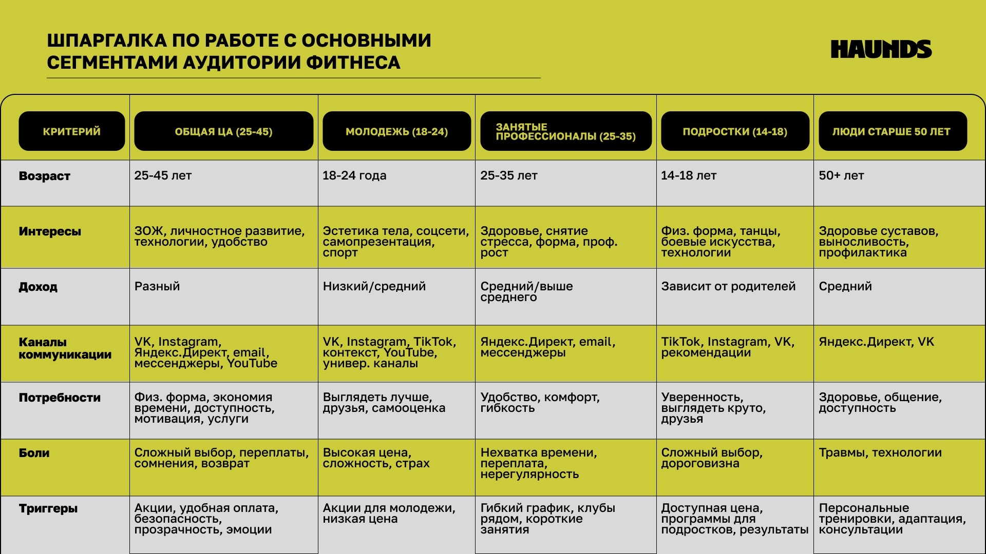 Перестаньте жаться к классической аудитории 25-45 лет, будьте как умные охотники, которые исследуют новые территории. Находите недооцененные сегменты и тестируйте на них гипотезы. Кстати, мы подготовили карту сегментов фитнеса, чтобы вы забрали шпаргалку себе, пользовались ей каждый раз при настройке кампаний и вспоминали нас добрым словом.
