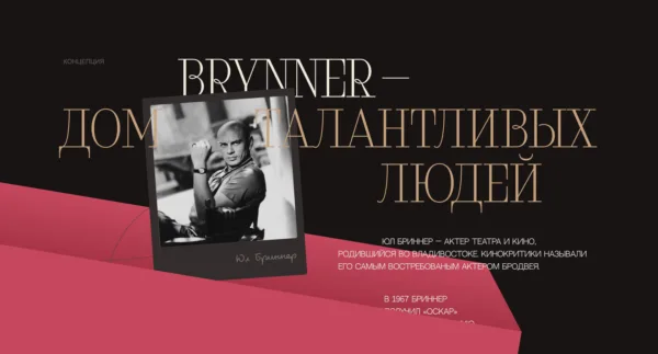 Семья Бриннеров именитая и уважаемая, а Юл Бриннер — знаменитый голливудский актер. На базе этого решение пришло само собой: всю концепцию нашего сайта мы построили на основе фильмов именитого артиста. Заголовки разделов сайта — это реальные названия его картин. Весь дом окутан романтикой театра и кино. Вы — главный актер, дом — ваша сцена.