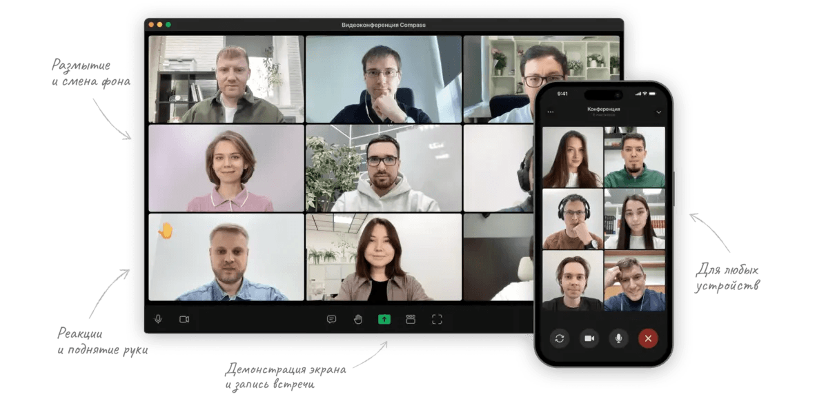 Видеоконференции, разумеется, идут в комплекте с корпоративным мессенджером.Cкачать и попробовать мессенджер можно на официальном сайте: getcompass.ru.
