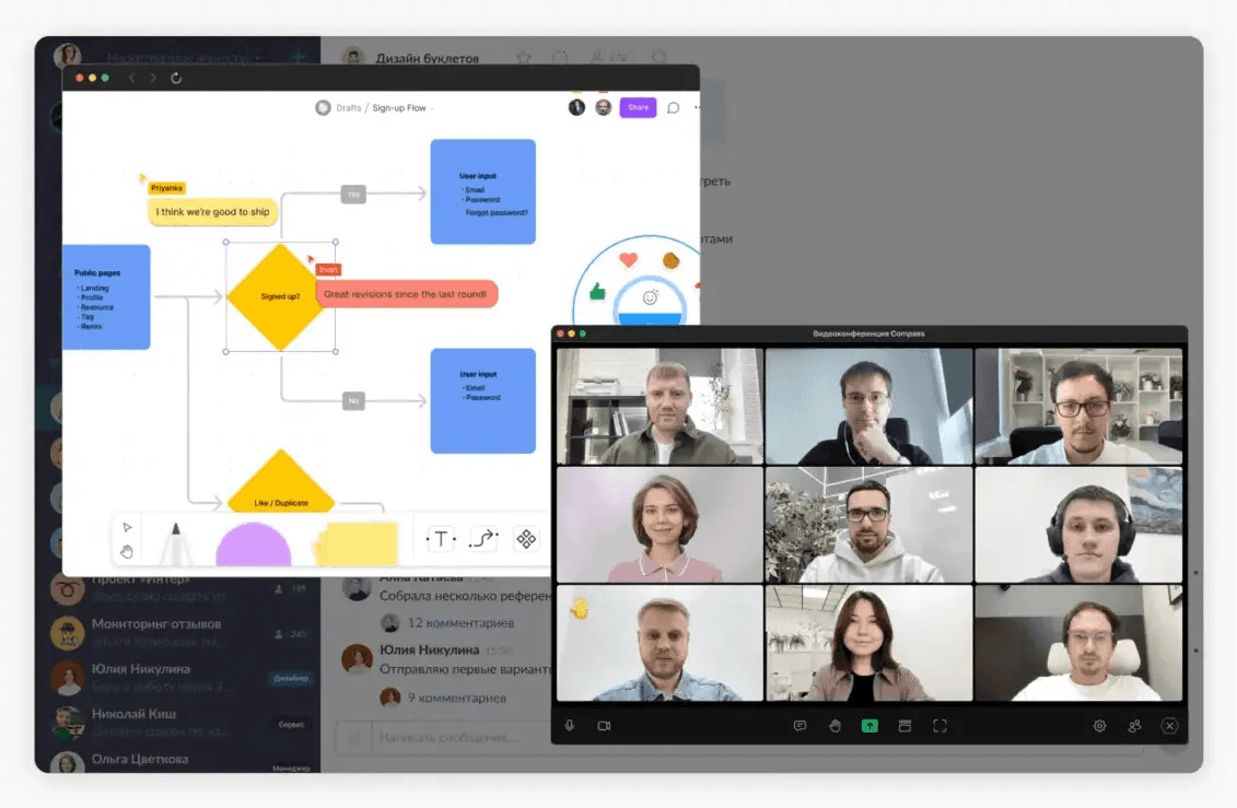 Если найти альтернативу голосовым звонкам обычным пользователям худо-бедно ещё можно, то то для бизнеса и общения в команде всё несколько сложнее. В общем, хочу напомнить о российском решении — корпоративном мессенджере Compass со встроенными видеоконференциями. Я о нём уже неоднократно рассказывал, в том числе о том, как выбирал его в качестве рабочего инструмента для своей команды.