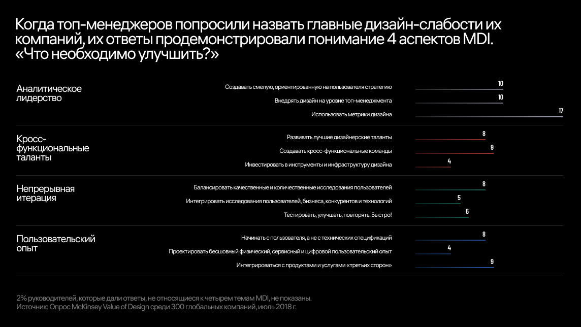 Компании, которые входят в топ-25% по дизайну — и являются лидерами по финансовым показателям — преуспели во всех четырех областях. И даже больше — их руководители, кажется, интуитивно понимают темы MDI. Когда топ-менеджеров попросили назвать главную слабость их организаций в области дизайна, 98% ответов соответствовали четырем аспектам MDI (рис. 4б).