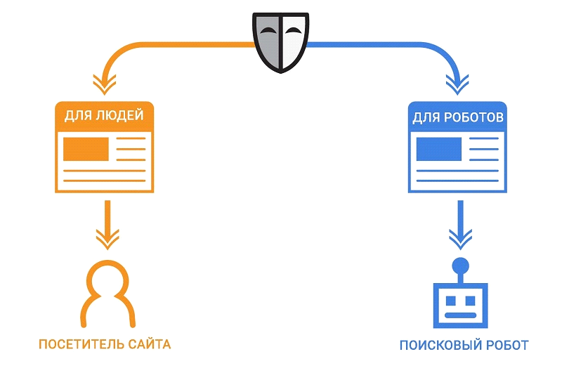 Для этого на сайт может быть установлен скрипт, который по определённым характеристикам, таким как: тип устройства, ip-адрес, язык, часовой пояс, utm-метки, user agent и т.д. будет отделять роботов от людей и показывать им совершенно другой текст.