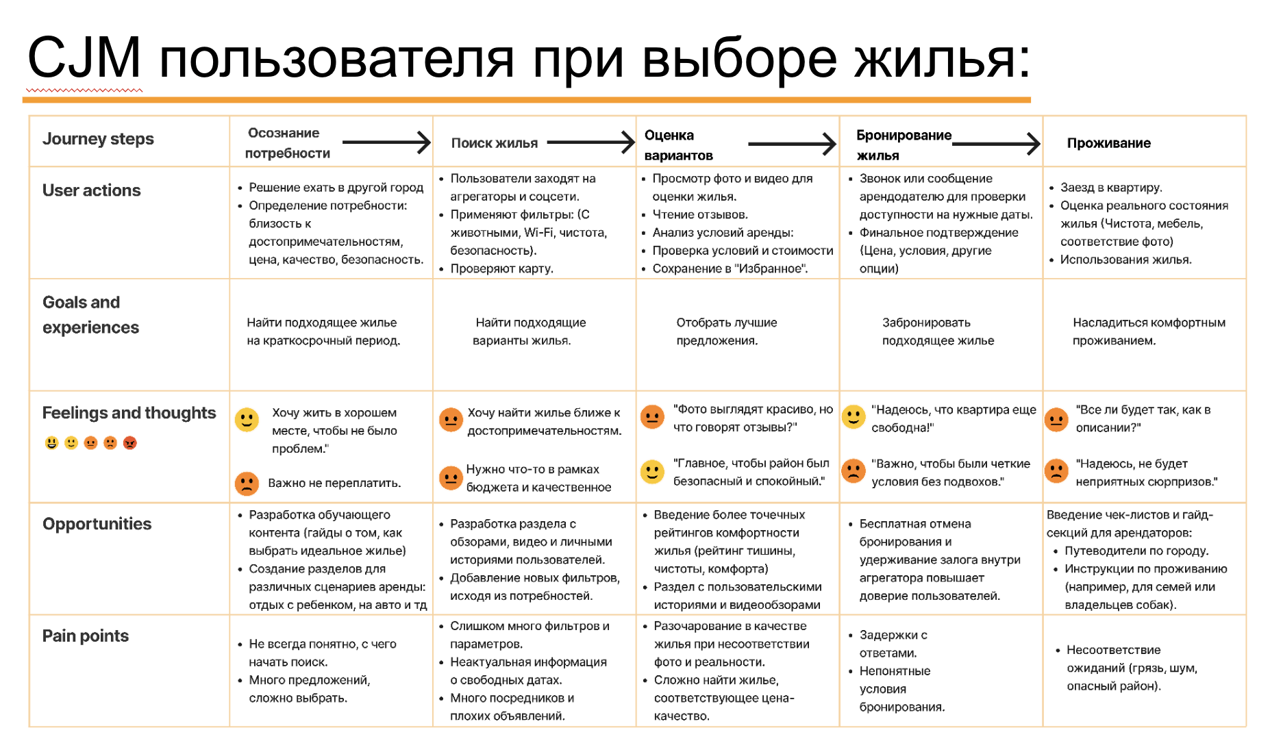 На основании исследования построили основной CJM пользователей при выборе жилья: