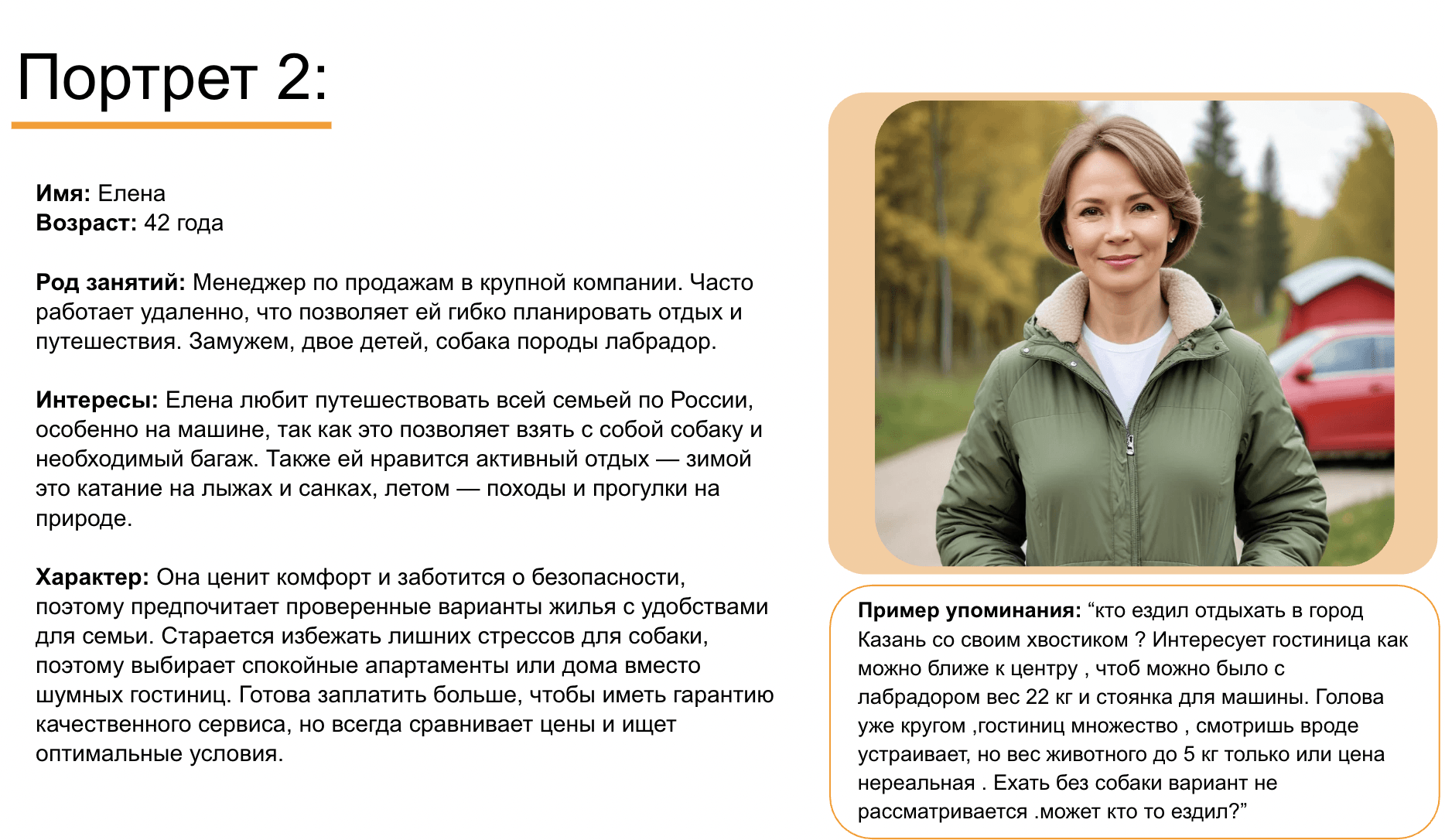 Фильтр «Удобства для животных» и контент о путешествиях с питомцами улучшат опыт владельцев животных. Продвижение через нативную рекламу и интеграцию в мероприятия для собаководов укрепит лояльность этой категории пользователей.