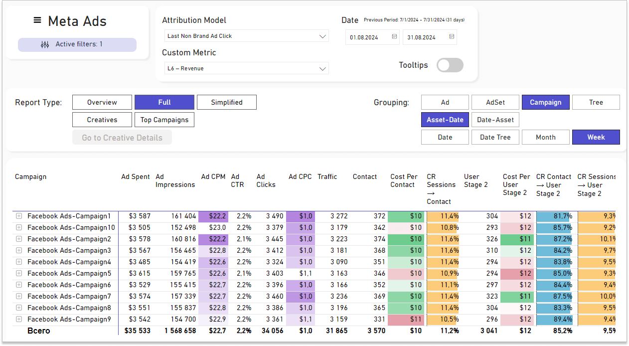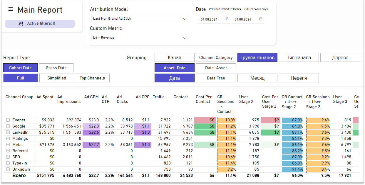 В сквозной аналитике применяется когортное отображение отчётности — пользователей разбивают на группы и отслеживают их активность. Например, если человек познакомился с продуктом на прошлой неделе, а купил на этой, система привязывает все дальнейшие шаги клиента к первому касанию.