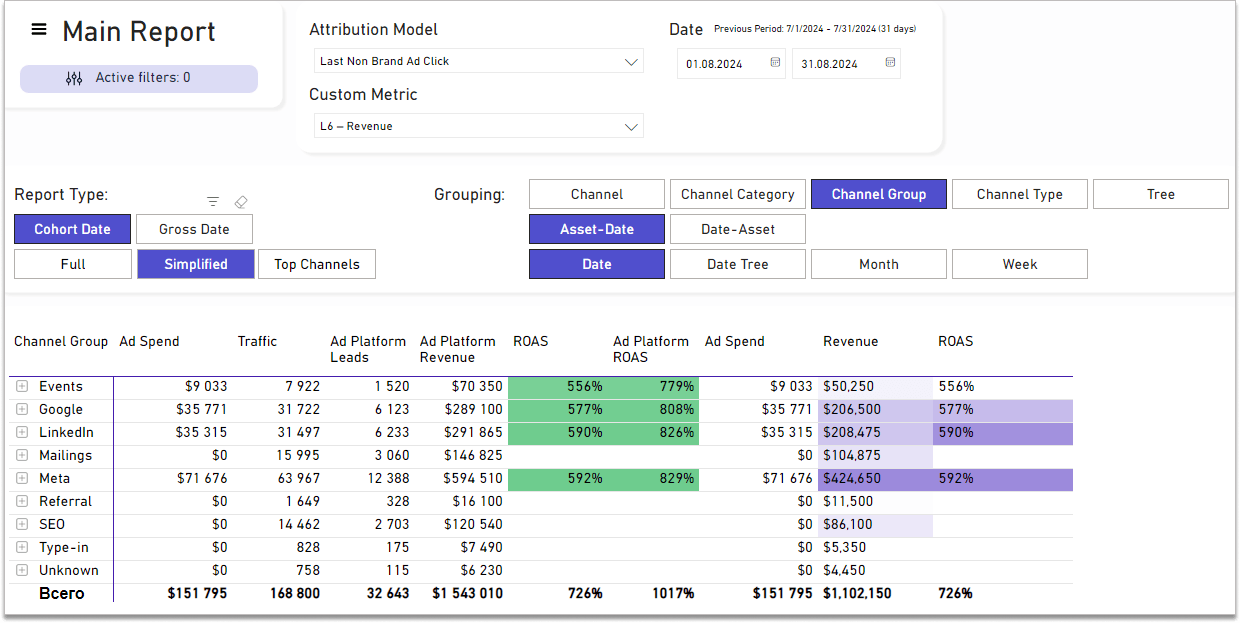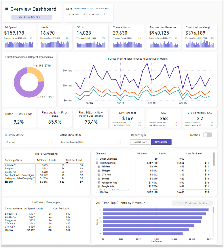 Сквозная отчётность показывает компании достоверные данные от расходов на маркетинг до доходов компании. Система собирает информацию из разных маркетинговых каналов, социальных сетей и систем веб-аналитики, например, Яндекс.Метрики и Google Analytics. Затем объединяет её с данными из CRM и других CPD, ERP-платформ и представляет эту информацию в виде подробных отчётов. Они дают чёткое понимание того, как рекламные каналы и кампании влияют на реальные бизнес-результаты, а не просто считают потенциальных клиентов.