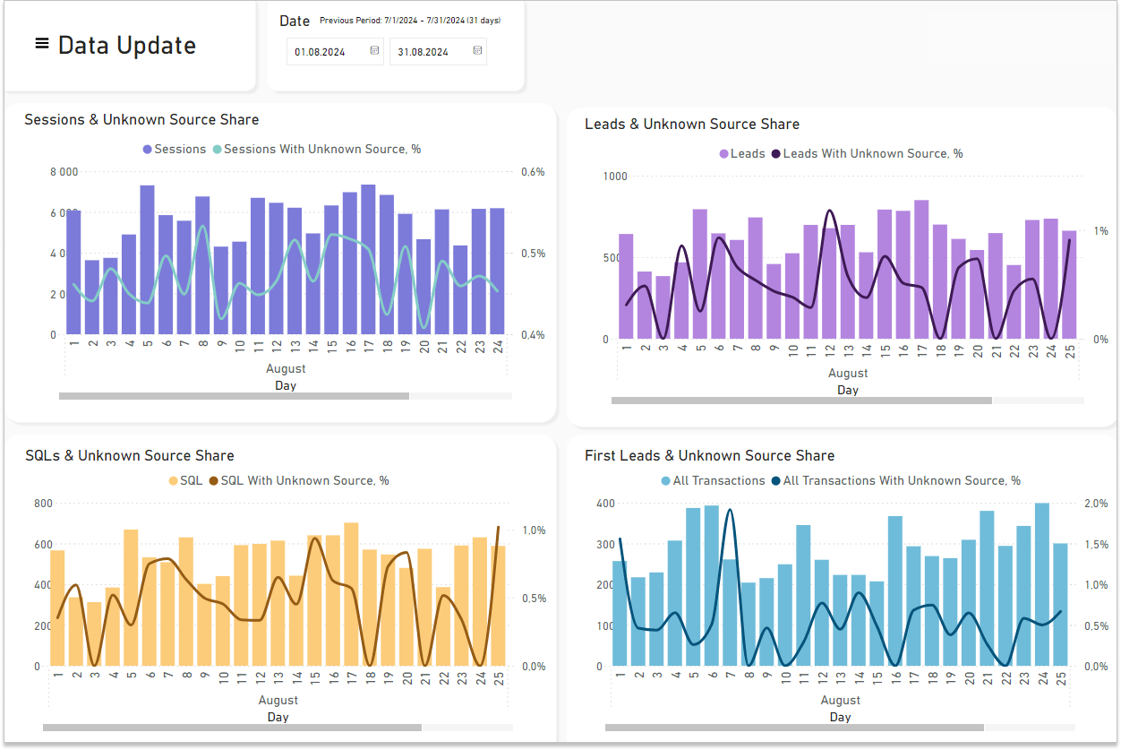 Команда, которая следит за отчётностью сквозной аналитики, ежедневно проверяет информацию на достоверность. Это позволяет вовремя находить расхождения в источниках данных и базе системы, найти причину и устранить проблему. Например, если кто-то из подрядчиков клиента запустил рекламу с неверной utm-меткой, в отчётах могут появиться не привязанные лиды. Специалистам важно вовремя это заметить.