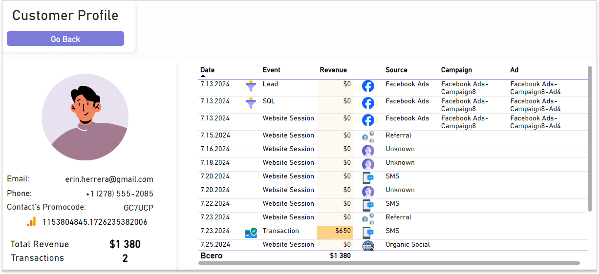 Ещё в отчётах сквозной аналитики есть хронология касания клиента с продуктом — она позволяет посмотреть всю историю клиента: переходы по рекламным объявлениям, действия на сайте, заказы и покупки. Например, можно зайти в профиль человека и посмотреть, с какой РК он пришёл, что делал и сколько денег принёс. Система определяет пользователя по ID, поэтому видно, когда действия на сайте совершает один и тот же человек.
