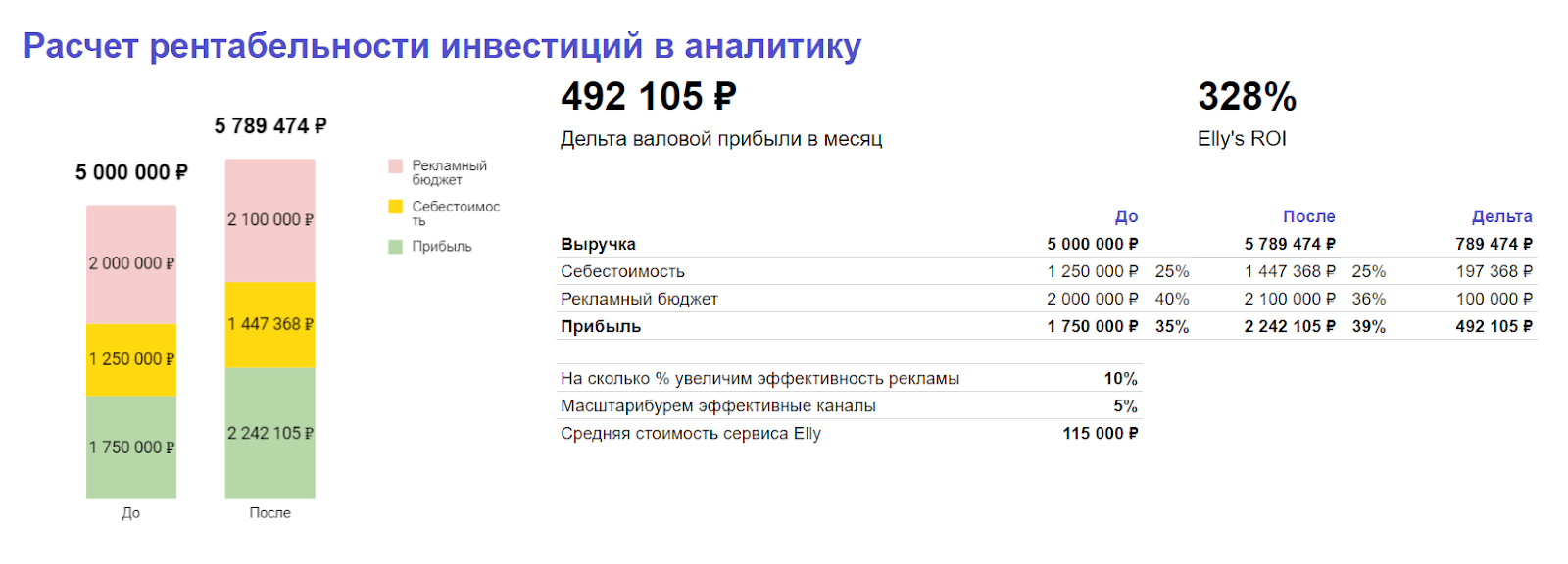 Простой способ примерить на себя сквозную аналитику — коробочное решение от Elly Analytics для малого и среднего бизнеса. Это стандартный набор отчетов без сложных моделей атрибуции — по источникам трафика и окупаемости рекламы. Вам не придется отдельно платить за внедрение системы — вы тратите деньги только 100 000 рублей в месяц на обслуживание. Через три недели система соберет первые отчеты, а вы сможете сделать выводы о своей маркетинговой эффективности, оптимизировать продвижение и сэкономить на рекламе.
