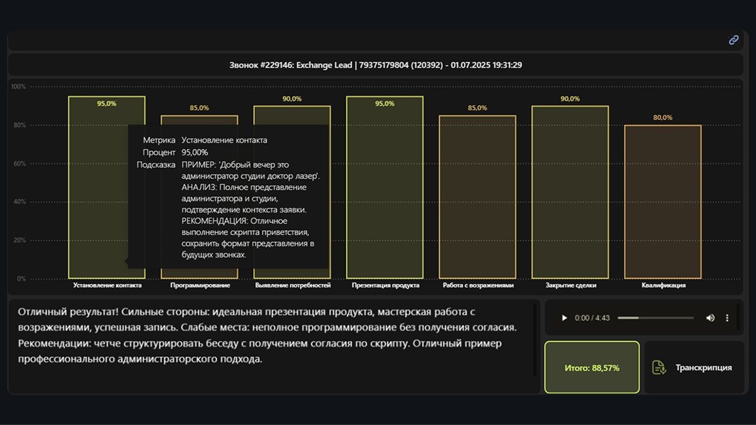 Мало кто задумывается, но каждое неправильно выбранное слово или затянутая пауза могут в итоге уменьшить вероятность заключения сделки. С помощью ИИ эти слабые места становятся очевидными и устраняются мгновенно.
