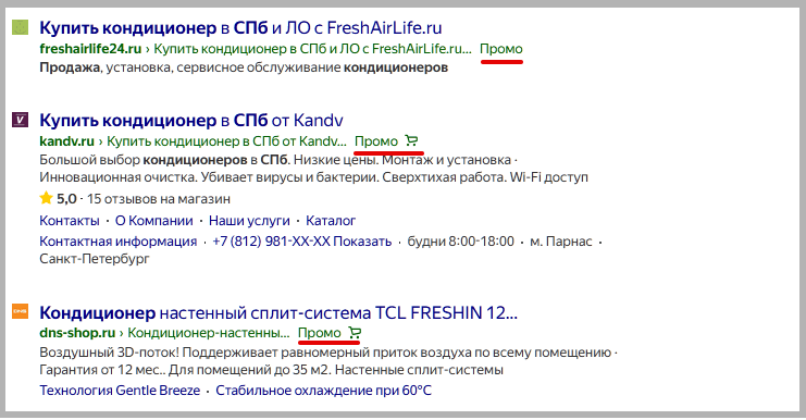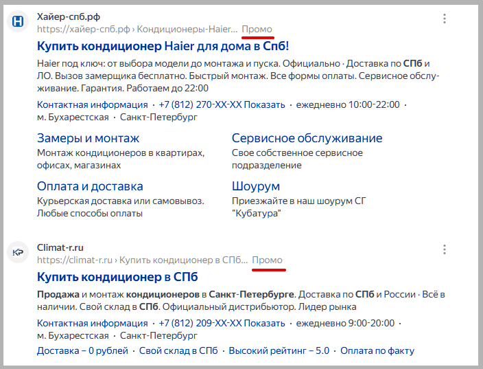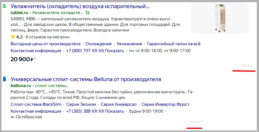 С 28 апреля Яндекс убрал метку. И сейчас проводит сплит-тест — экспериментирует с внешним видов рекламных блоков. Вместо знака «Реклама» появилась малозаметная надпись «Промо». Мы обнаружили четыре варианта разметки промо-блоков: некоторые из них более очевидно указывают на рекламу, другие — сильно мимикрируют под органическую выдачу.